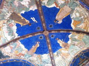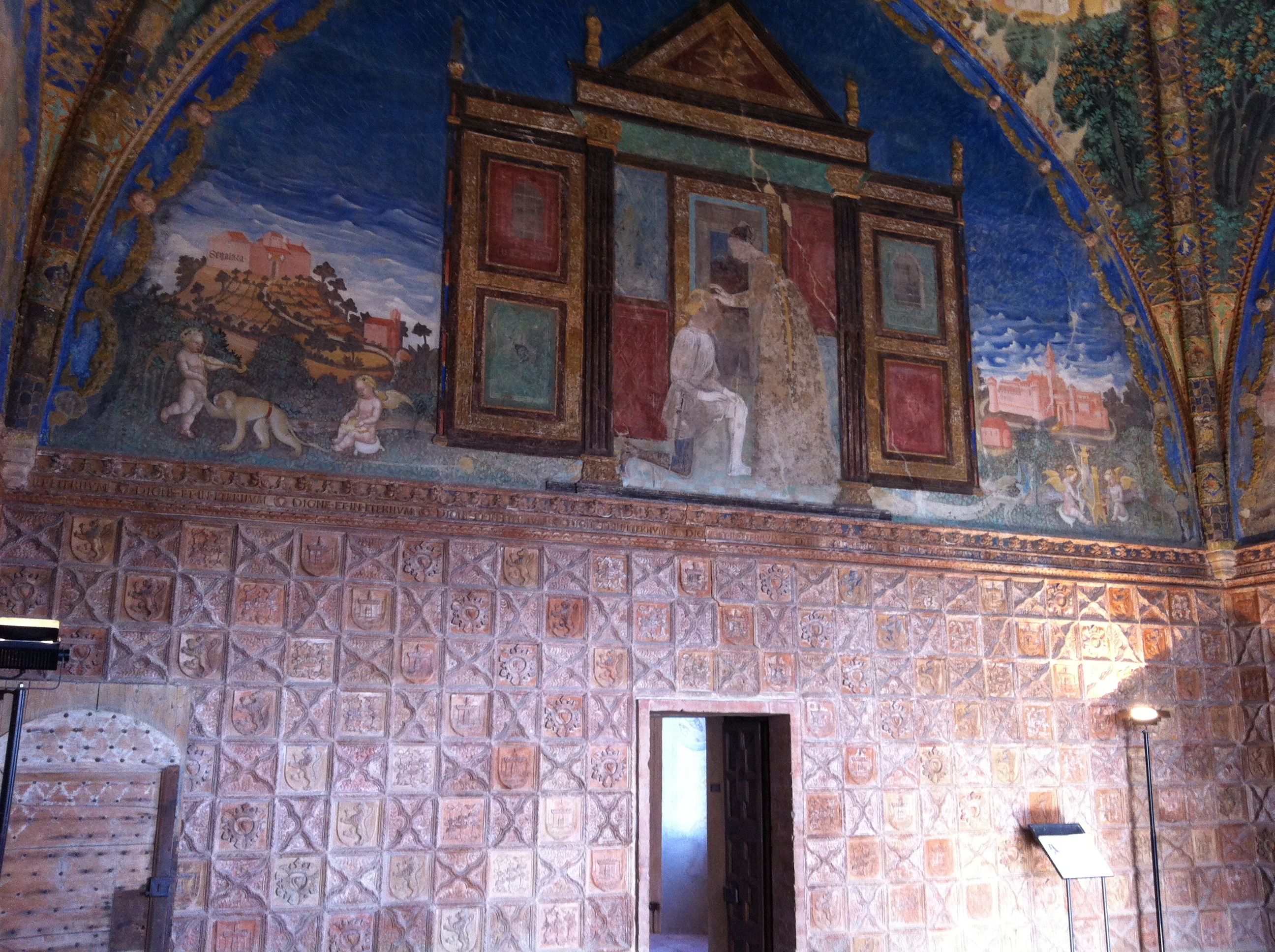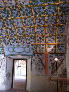 Ieri ci siamo andati in una mattina di domenica che il meteo voleva nebbiosa, e invece splendeva di un sole credo insolito nel parmense. L’avevamo già visto ma, avendo poco tempo a disposizione la scelta è stata quasi obbligata. Perché Torrechiara all’interno smentisce l’aspetto ruvido e guerriero dell’esterno. Con una serie di sale affrescate nella seconda metà del 500 a grottesche dallo specialista Cesare Baglione.