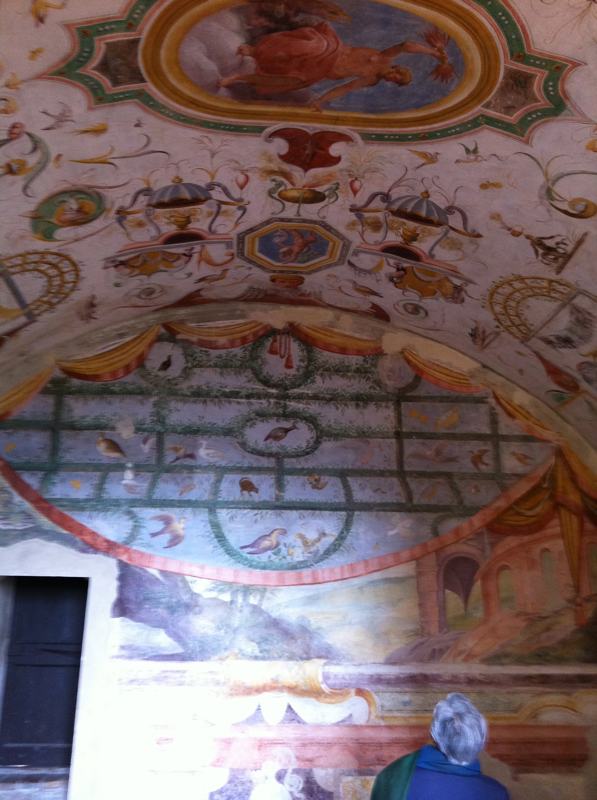 Le sale si susseguono, una in fila all’altra, al piano terra e anche al primo piano, e questi affreschi sono dovuti a uno dei proprietari successivi del maniero.