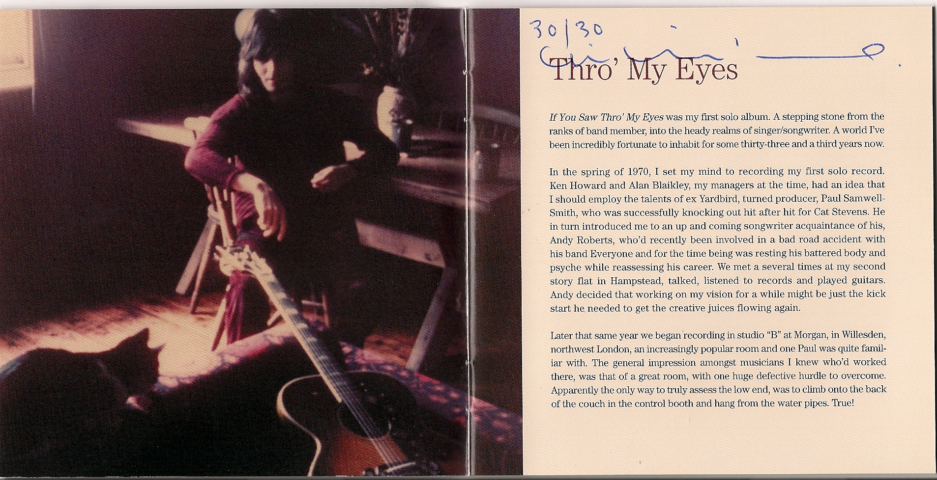 Qui di lato la copertina intera (essendo uscito al tempo in cui gli album erano elleppì, le copertine erano cose serie) mostra il nostro pensoso che guarda fuori dalla finestra, mentre accarezza il gatto. Ian aveva allora 24 anni e aveva già attraversato i Fairport Convention, di cui era stato la prima voce maschile, e poi era stato anche primo nella classifica dei singoli inglesi con la versione di Woodstock (la canzone di Joni Mitchell) realizzata con i Matthews Southern Comfort (gruppo nato per il suo primo album solista e poi durato altri due album). Questo era dunque il primo album a suo nome realizzato per la Vertigo, con la supervisione di Paul Samwell-Smith, ex bassista degli Yardbirds e allora produttore, tra gli altri, di Cat Stevens. Ne seguì un altro, “Tigers will survive”, bello ma meno del primo. Poi il nostro creò i Plainsong, con l’amico Andy Roberts, conosciuto tramite Samwell Smith all’epoca di “If you saw thro’ my eyes”. Tre anni dopo emigrò negli States per iniziare un’altra vita, recuperando il vero nome di battesimo, Iain…