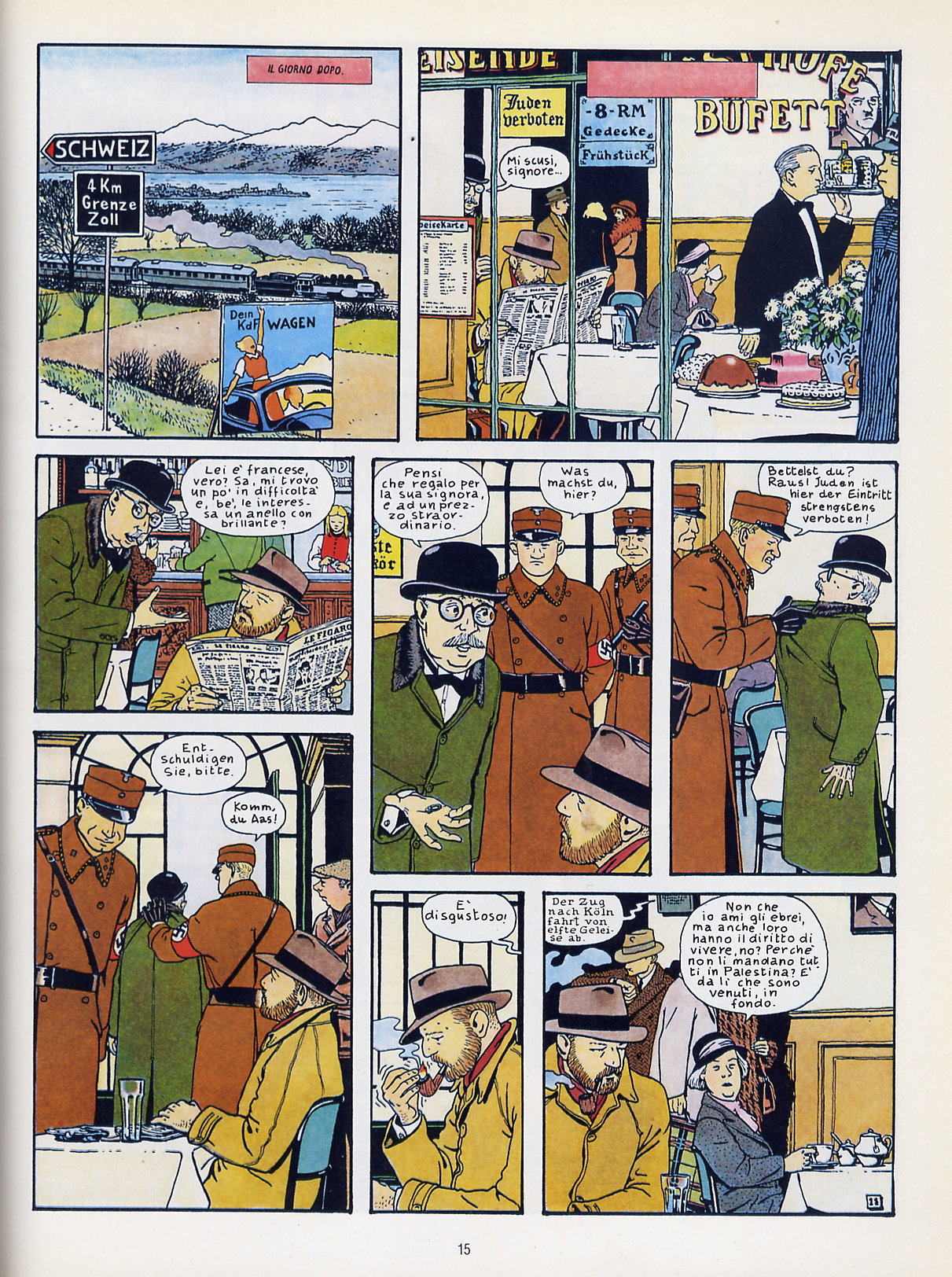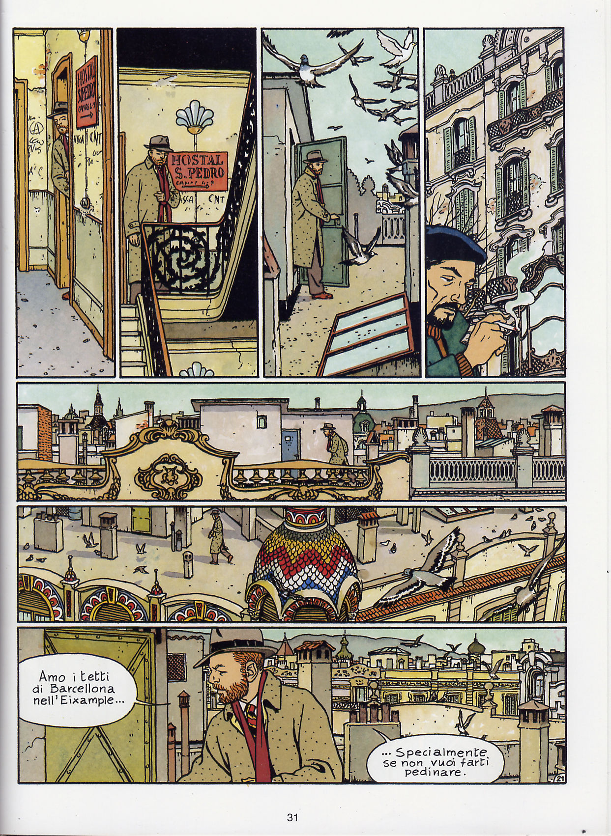 Dopo Rapsodia ungherese e la seconda avventura di Fridman, La porta d’oriente, che è del 1985, Giardino lascia il suo eroe “in sonno” per quasi quindici anni e si dedica a un altro personaggio Jonas Fink, giovane ebreo praghese la cui storia inizia negli anni 50, di cui progetta una trilogia (ma al momento sono uscite solo due – bellissime – storie, L’infanzia e L’adolescenza). Poi torna a Fridman con un’avventura ambientata nella Guerra di Spagna, intitolata No pasaràn, che gli prende un po’ la mano e si espande a poco a poco fino a diventare una trilogia che lo impegnerà per dieci anni (l’ultimo episodio è del 2009). Il segno, come vedete a sinistra, è molto maturato, attraverso l’esperienza di Jonas Fink: è più “calmo” e insieme preciso, sempre accuratissimo ma meno affastellato – e i tetti policromi di Barcellona gli offrono possibilità calligrafiche strepitose. La storia vede Max tornare sullo scenario della guerra civile spagnola, da cui si era allontanato dopo essere stato ferito, per cercare un amico scomparso, ebreo anche lui. Fridman è un eroe atipico, commerciante di tabacco, benestante, colto, borghese, con una figlia, Ester, anche lei con i capelli rossi.