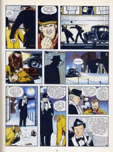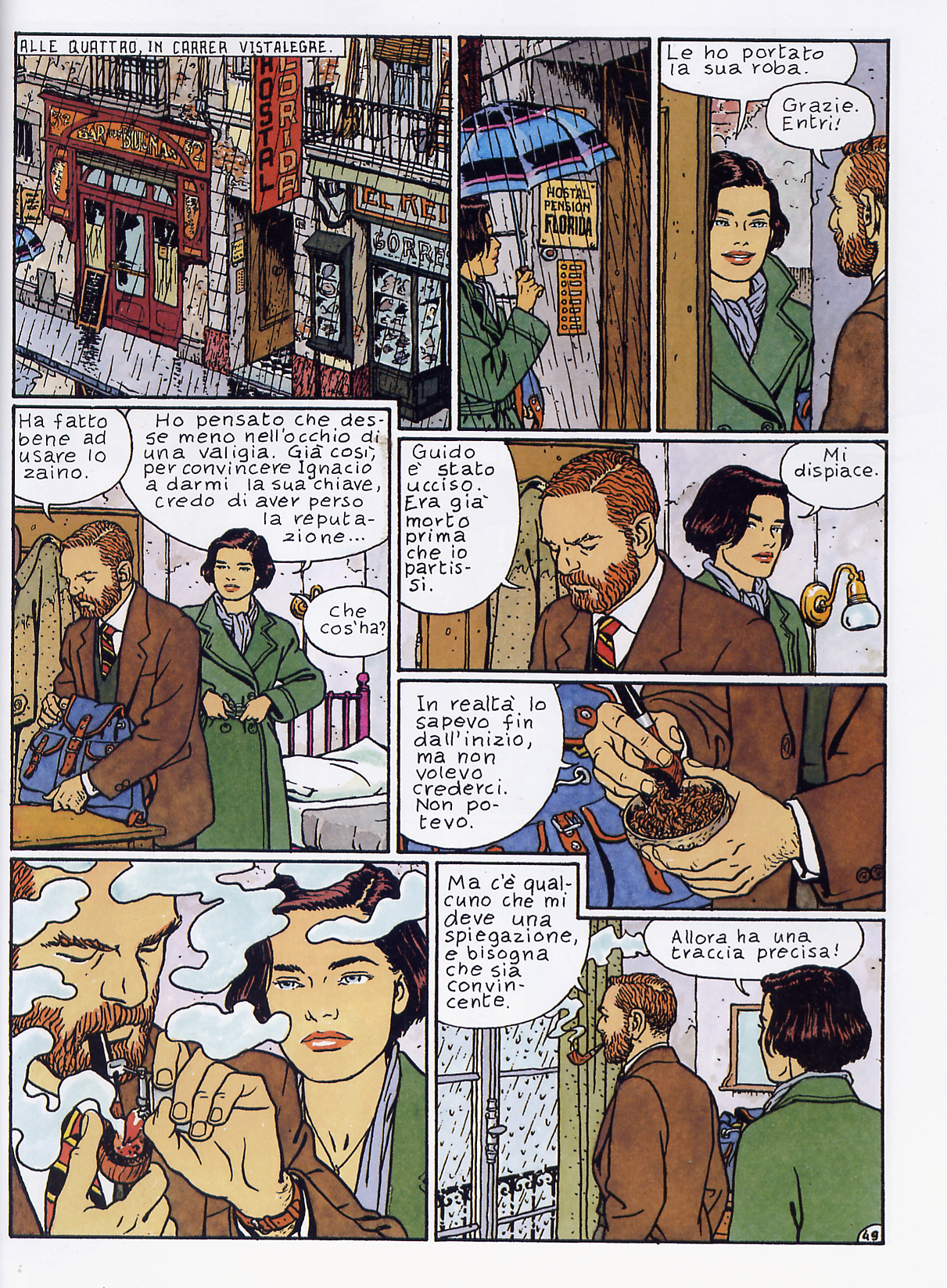 Dicevamo del segno di Giardino. Che da grande appassionato e cultore di fumetti si è ovviamente ispirato a grandi disegnatori venuti prima di lui. Leggete cosa dichiara Giardino in un’intervista a Leonardo Gori: “Fridman ha tantissimi debiti indiretti, fra cui anche il Paperino di Barks, ma uno solo diretto: Corto Maltese di Hugo Pratt. E non tanto per l’ambientazione storica. C’è una storia di Pratt che somiglia moltissimo ad un determinato racconto di Jack London. Ebbene, in quella storia Corto dice, en passant: ‘Ho conosciuto un Jack London, in Siberia, tempo fa…’. Questo utilizzare la Letteratura come fosse vita, queste citazioni non dotte, non gratuite, ma utili per caratterizzare i personaggi, sono cose che io ho tentato di seguire”. E anche nel segno in questa tavola (come in tante altre) c’è un forte debito con Hugo Pratt. Guardate il frame in alto a destra, quando il tassista prende a cazzotti Fridman che cade: se non è un omaggio a Corto questo…