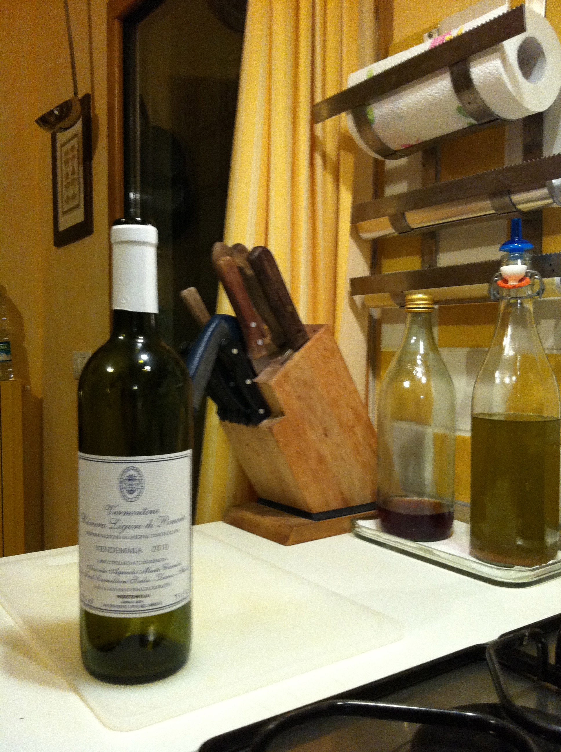 C’è però un solo tipo di vino. Che ovviamente ho voluto subito provare. Si tratta di un vermentino ligure prodotto dall’azienda agricola Monte Carmelo di Loano, dei frati carmelitani scalzi. Un bianco un po’ pallido, quello del 2010, di buona gradazione (13°) e acidità sostenuta, con discreti sentori di frutta. Molti, quando sentono la parola vermentino, pensano alla Sardegna. ma il vitigno probabilmente nasce in Spagna (o addirittura in Portogallo e arriva in Sardegna nell’800 dopo essere passato dalla Francia (dove lo chiamano Rolle) e poi dalla Liguria. Il vermentino dei carmelitani è buono, anche se meno rotondo (forse deve invecchiare un po’) di quello che per me è il vermentino (rolle) di riferimento, il bianco dell’azienda Val d’Iris di Seillans, nel Var (vicino a Cannes).