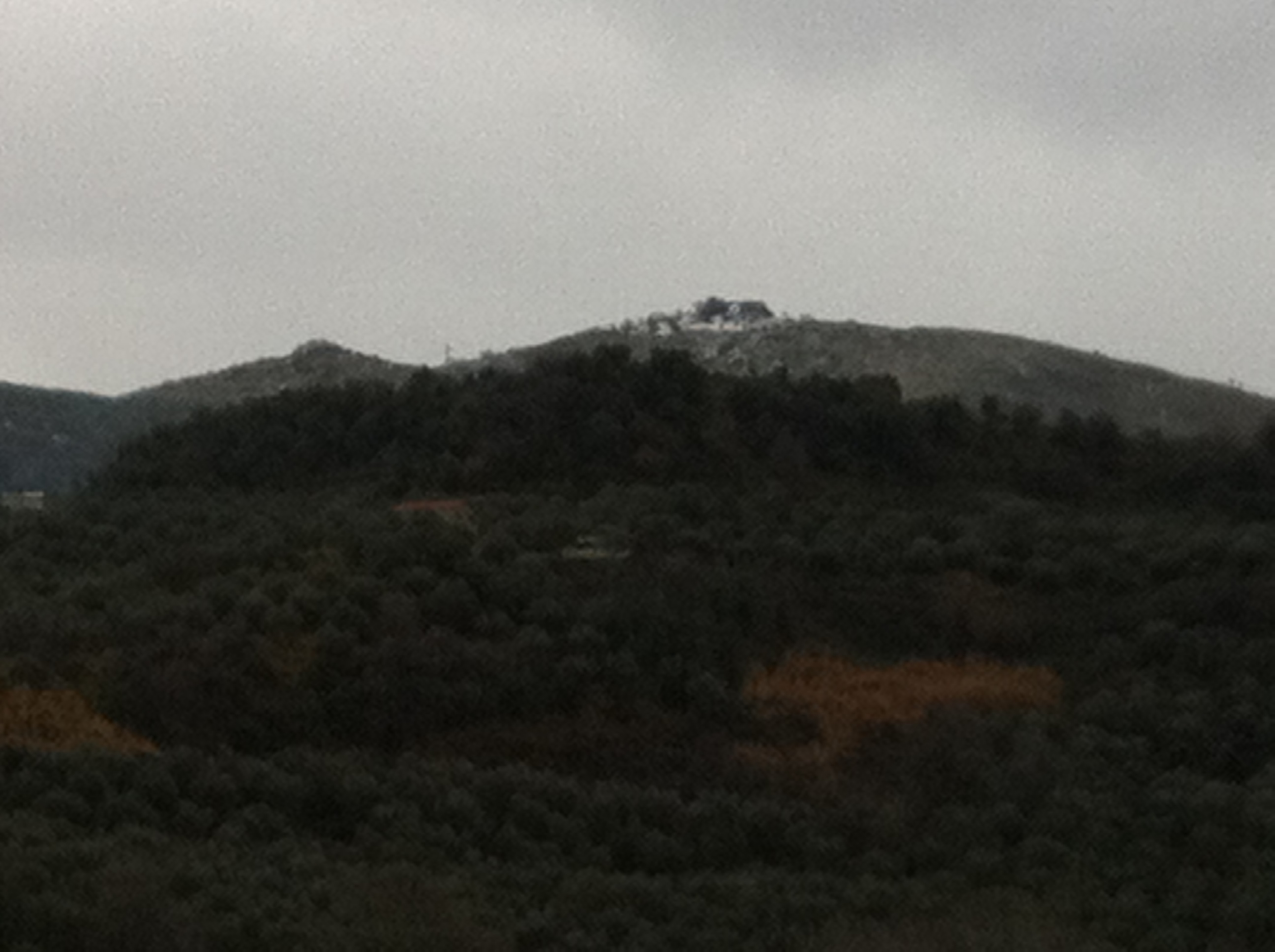 La foto è scrausa, lo so. Ma con l’Iphone e questa luce è il massimo che potevo fare. I paesi tutto intorno sono imbiancati e anche sul Monte Acuziano, lo posso garantire anche se dalla foto non risalta così perspicuamente, c’è neve attorno e sopra le rovine della chiesa di S.Martino, alla bella quota di 450 metri slm.