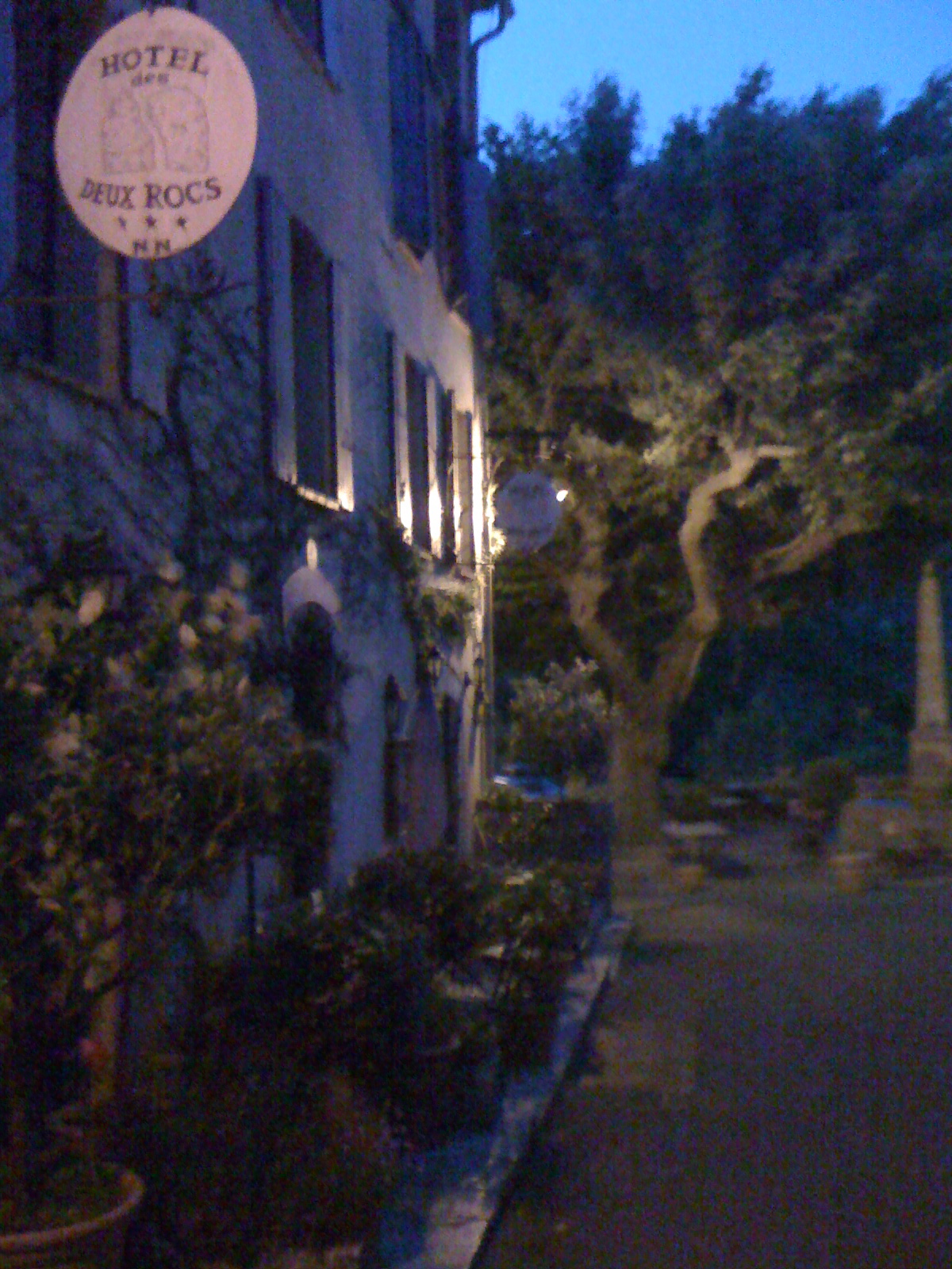 Il paese è Seillans, nel dipartimento del Vars in Provenza. L’Hotel des Deux Rocs è uno dei miei “posti dell’anima”. È in un edificio del seicento, con gli arredamenti retro, le camere una diversa dall’altra, i solai dei pavimenti un po’ inclinati, un gran gusto nei particolari, un ristorante di ottimo livello. Ogni volta che vado a prendere Daniela a Lourdes per uno dei nostri viaggi nel Sud della Francia o nel Nord della Spagna, una sosta all’andata o al ritorno (o entrambe le volte) all’HDDR è assicurata. Così piccolo com’è, Seillans ha tre buoni ristoranti: quello dell’albergo e due nella piazza centrale del paese, un posto anch’esso magico, sotto le fronde di enormi platani e accanto a una