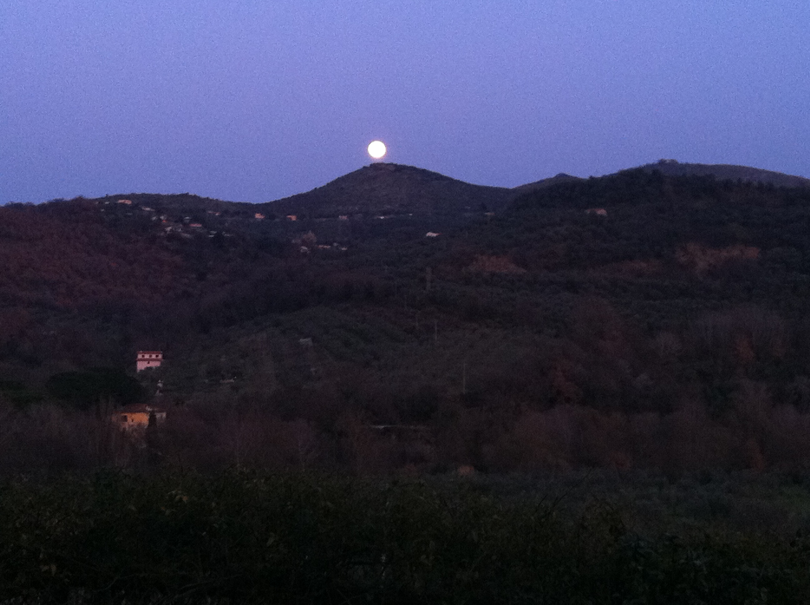 Devo confessare che ho sempre guardato la luna un po’ distrattamente. Ma l’altra sera quel disco bianco attaccato come un palloncino sul crinale della collina mi ha affascinato. L’immagine un po’ magrittiana mi ha spinto a sfoderare l’iphone e a scattare qualche istantanea. E rivedendo le foto mi sono chiesto se esista una parola per descrivere il levarsi della luna, così come la parola alba descrive il levarsi del sole, il suo sorgere dall’orizzonte. Ma mi pare, giricchiando su gogol (come direbbe l’orrendo B.) che no, un termine appropriato non c’è. Tutti parlano di “sorgere della luna”, ma l’atto del sorgere non è “nomato”.