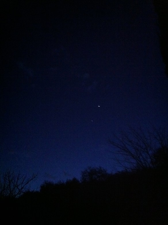 I due puntini nel cielo sono molto più luminosi di quanto non abbia captato l’iphone stasera due minuti prima delle sette. Pare siano Giove e Marte in una congiunzione astrale non proprio comune. Giove, quello più in alto e più grosso, è luminosissimo. Marte, più piccolo, è giustamente rossastro.