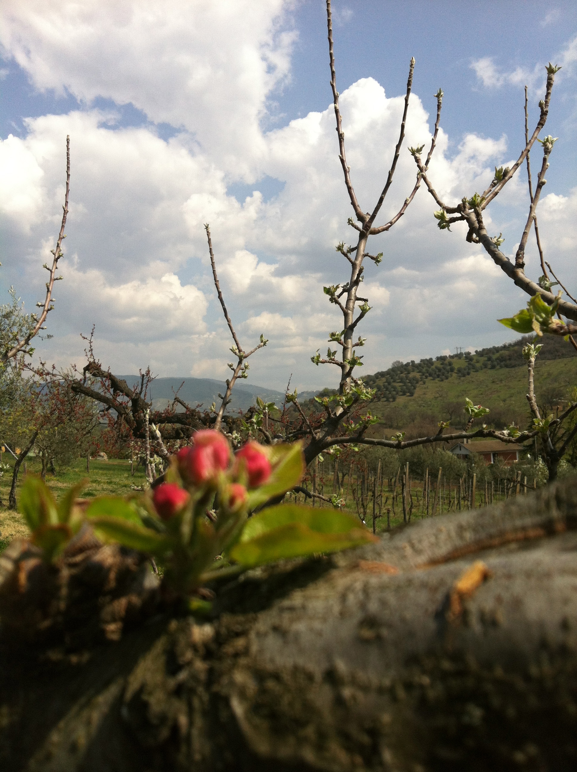 Bianco-rosa e un po’ cangianti quelli del melo (i fiori più belli, a mio avviso) che arrivano un po’ dopo (quelli fotografati qui sotto sono gli unici già sbocciati a oggi)