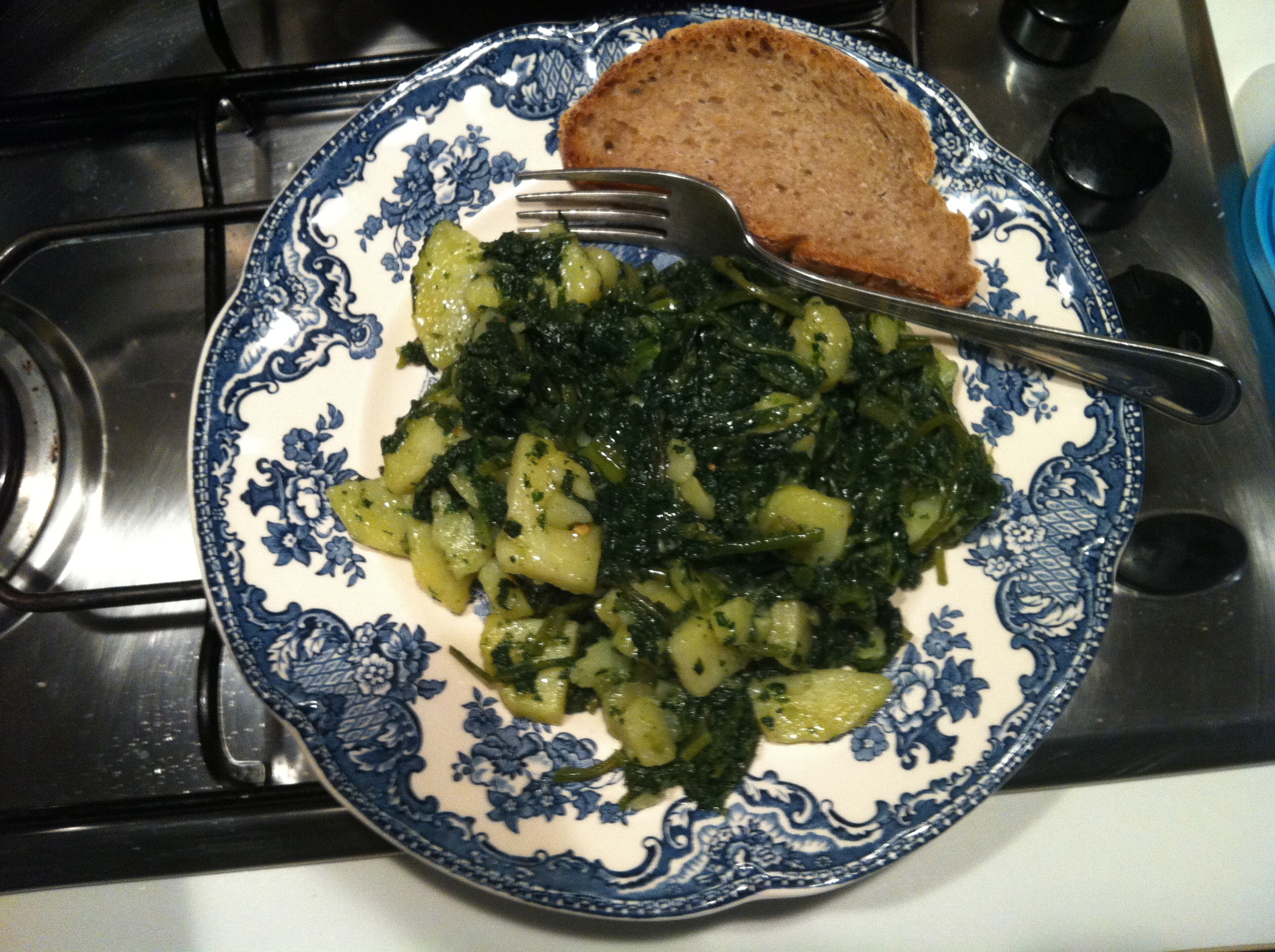 E oggi, dopo le zucchine, un mix che mi ha insegnato mio fratello: cicoria ripassata con patate al vapore. La cicoria è cicorione: cinque minuti e hai già raccolto quello che serve per due. Una bella lessata e poi, nella padella, tanto aglio fresco olio e peperoncino (l’aglio fresco è fantastico: ha un odore e un sapore penetrante ma non si “ripropone” come quello maturo). Una volta ripassata, alla cicoria si mischiano le patate cotte al vapore e si lasciano un po’ di tempo assieme a compenetrarsi a vicenza. Un connubio perfetto. Un filo d’olio a crudo, il pane calabrese e un po’ di Bellofausto 2011. E anche questa sera la cena l’abbiamo sgavagnata.