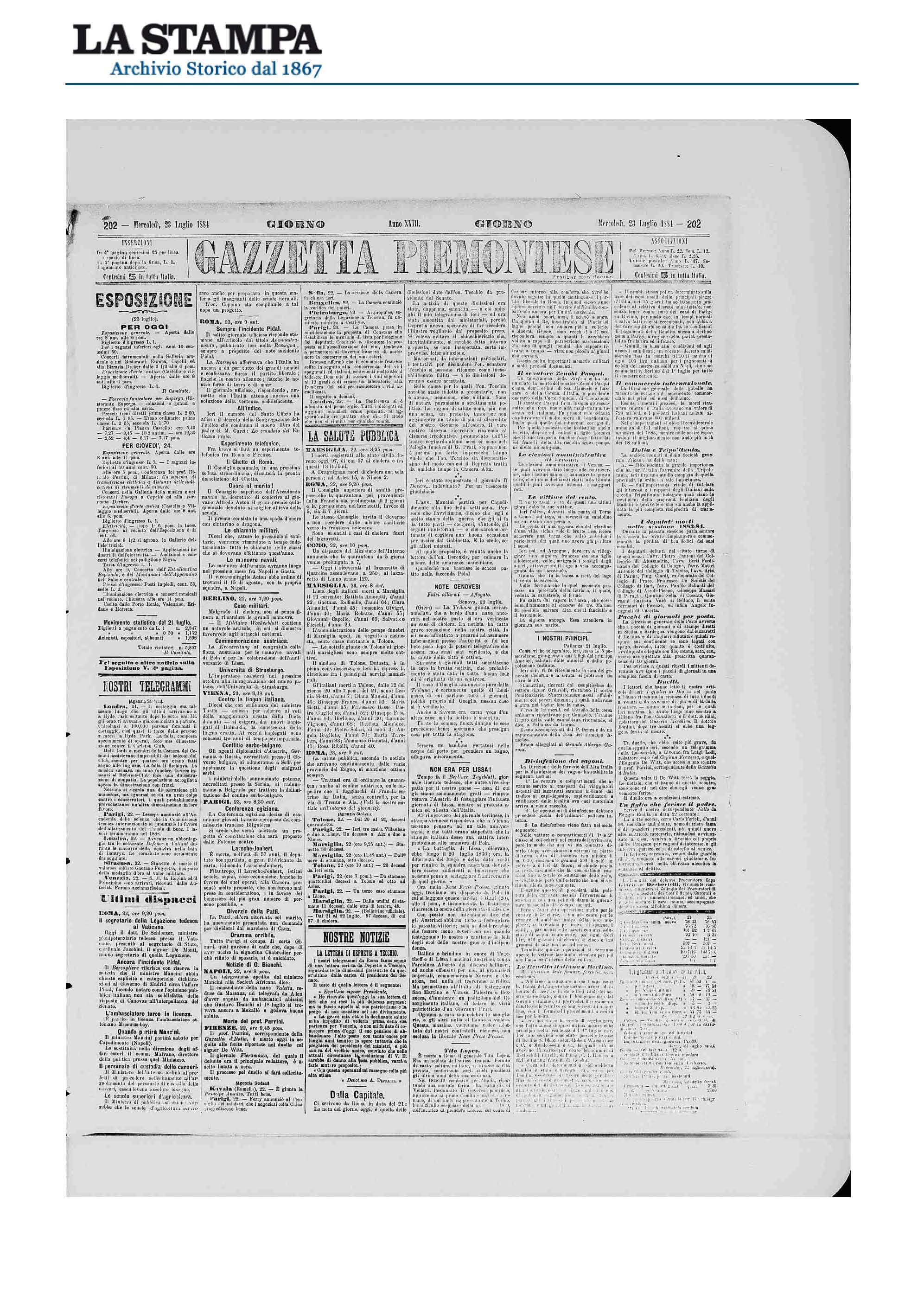 La notizia, dell’Agenzia Stefani, datata Londra 21 luglio 1884, appare in apertura della prima colonna della Gazzetta Piemontese (giornale che poi divenne La Stampa) del 23 luglio 1884. (Me ne ha mandato il file Andrea S., cugino di 12° o 13° grado, perché quel giorno è ospitato anche un articolo sulla morte del comune antenato Tito Lopez).