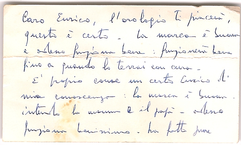 Sette anni fa, trovato il bigliettino che accompagnava l’orologio che mi venne regalato dal mio padrino per la prima comunione, scrissi questo post. Il mio padrino doveva avere allora, quando scrissi il post, qualcosa meno di novant’anni (doveva essere più o meno, qualcosa meno, coetaneo di mio padre che era del 1922). Oggi rileggendo il post e prima di ribloggarlo mi sono chiesto se fosse ancora ancora vivo. Ho cercato sulla rete e non ho trovato prove in un senso o nell’altro. ma ho trovato una sua lunga e argomentata lettera di un anno fa a un quotidiano on line sulla situazione della pineta di Fregene, la località in cui vive. Mi piacerebbe invecchiare così…
