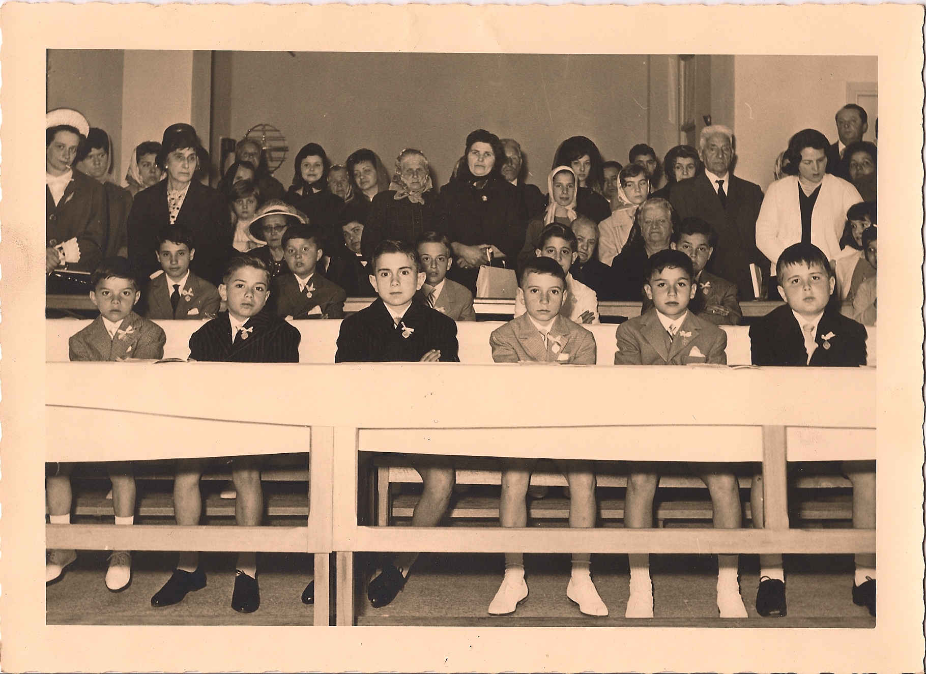 Ho narrato, qualche giorno fa, sull’onda dei ricordi sollevati dal biglietto con cui il mio padrino mi regalava l’orologio per la prima comunione, di quei giorni, della cerimonia della cresima, delle mani nodose del vescovo, del catechismo e del mio impatto (doloroso) con il piede di S. Pietro. Non ho nascosto il mio essere allora, diciamo così, rotondeggiante (mia sorella per farmi arrabbiare mi chiamava “papalla”, io non posso dire qui come la chiamassi…). Caso ha voluto che nella stessa scatola dove l’altro giorno ho trovato vecchie e meno vecchie foto, ci fosse anche questa.
