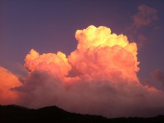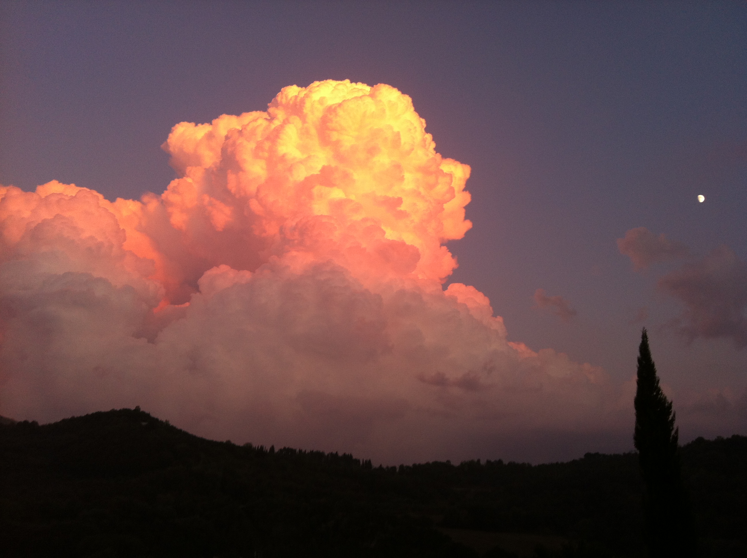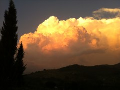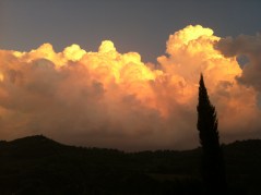 Stasera finalmente è arrivata la pioggia. Niente di straordinario, intendiamoci, ma i prati si sono bagnati un po’. Al terzo tentativo Beatrice gliel’ha fatta, dopo che due volte nel corso della giornata aveva prodotto qualche timida (e un po’ vergognosa) goccetta sparsa. E dopo la pioggia, sul monte Acuziano c’erano dei nuvoloni illuminati dal sole al tramonto. Uno spettacolo unico. Nuvoloni che si muovevano a vista d’occhio, gonfiandosi e spostandosi sul posto. Polposi, plastici, barocchi. Barocchissimi. Una cosa così non l’avevo mai vista. (Solo, in tono minore, qualche settimana fa; ma il tempo di andare a prendere l’iphone che il sole era già sceso giù e le nuvole avevano perso tutto il loro appeal).