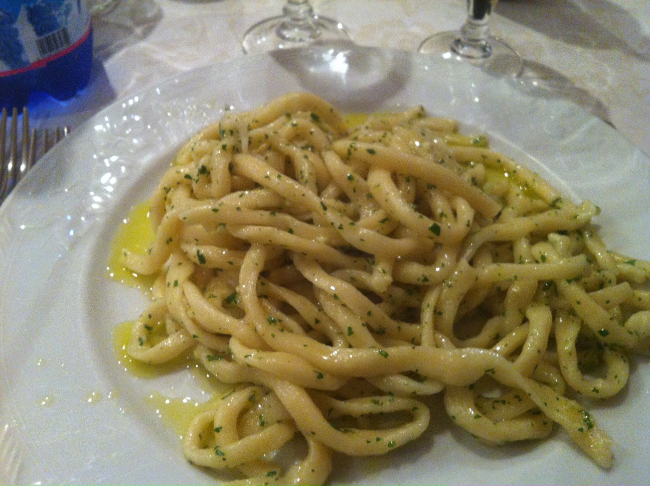 L’altra sera siamo stati a festeggiare il nostro quindicesimo anniversario nel ristorante “Tra amici”, gestito da un’amica di Daniela a Casaprota. E ci siamo mangiati, prima di una tagliata ai funghi porcini, un bel piatto di maccheroni a fezze conditi con un pesto di aglio, olio e maggiorana. È un patto tipico della Sabina, al quale è dedicata più di una Sagra. Io odio le sagre (con le dovute eccezioni): di solito c’è sempre troppa gente in spazi limitati, in sere d’estate nelle quali fa troppo caldo. (La mia eccezione preferita è la Sagra del Frittello che si svolge a Castelnuovo di Farfa l’8 dicembre. La consiglio a tutti: il “frittello” è il cavolfiore pastellato e fritto, e la sagra si svolge in un delizioso cortile nella parte vecchia del paese. E poi, essendo l’8 dicembre, il rischio è semmai quello della pioggia…).