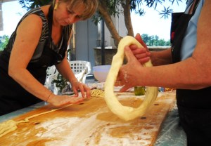 Tornando ai “maccheroni a fezze” è una pasta fatta con acqua e farina. Le “palle” di pasta vengono bucate fino a diventare ciambelle che poi, piano piano, vengono allungate con caratteristici movimenti delle mani fino a divenire un unico lunghissimo stringozzo, che poi alla fine viene ovviamente tagliato per cuocerlo. Ho trovato su internet questo link che aiuta a capire, dal quale ho tratto le foto qui sotto