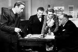 Una scena del Falcone Maltese. Da sinistra, Humphrey Bogart, Peter Lorre, Mary Astor e Sidney Greenstreet