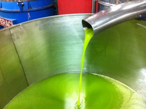 Stamattina abbiamo svuotato i contenitori nella botte d’acciaio. E a pranzo, bieta dell’orto, lessata appena raccolta, una fettina di pane e olio appena spremuto, con il suo colore verde, il suo bel pizzicorino e il retrogusto un po’ amarognolo, tipici dell’olio nuovo.