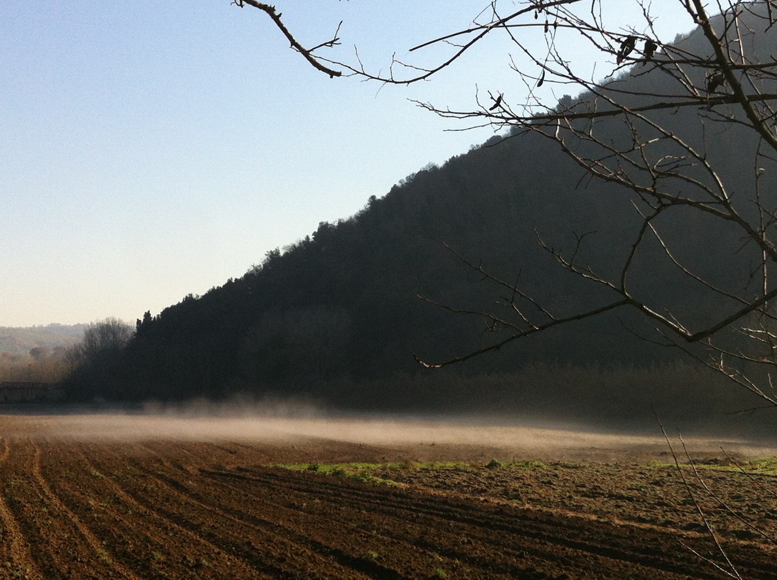 L’altra mattina, mentre rientravo a casa dopo una gitarella a Bocchignano e Castel S.Pietro, mentre stavo salendo verso la strada della Centrale (la costa collinosa che si vede nella foto è quella in cui, due chilometri più avanti, alberga il monastero di Farfa) sono rimasto affascinato dallo spettacolo che ho provato, con risultati non esaltanti, a immortalare con l’iphone. Questa piccola coltre di nebbiolina, bassa ma spessa, dovuta evidentemente all’effetto del calore del sole (che in quel punto giunge abbastanza tardi, specie d’inverno) sulla terra umida per le recenti piogge e anche per la vicinanza del Fosso Riana, il Farfarus che scorre sotto l’abbazia.