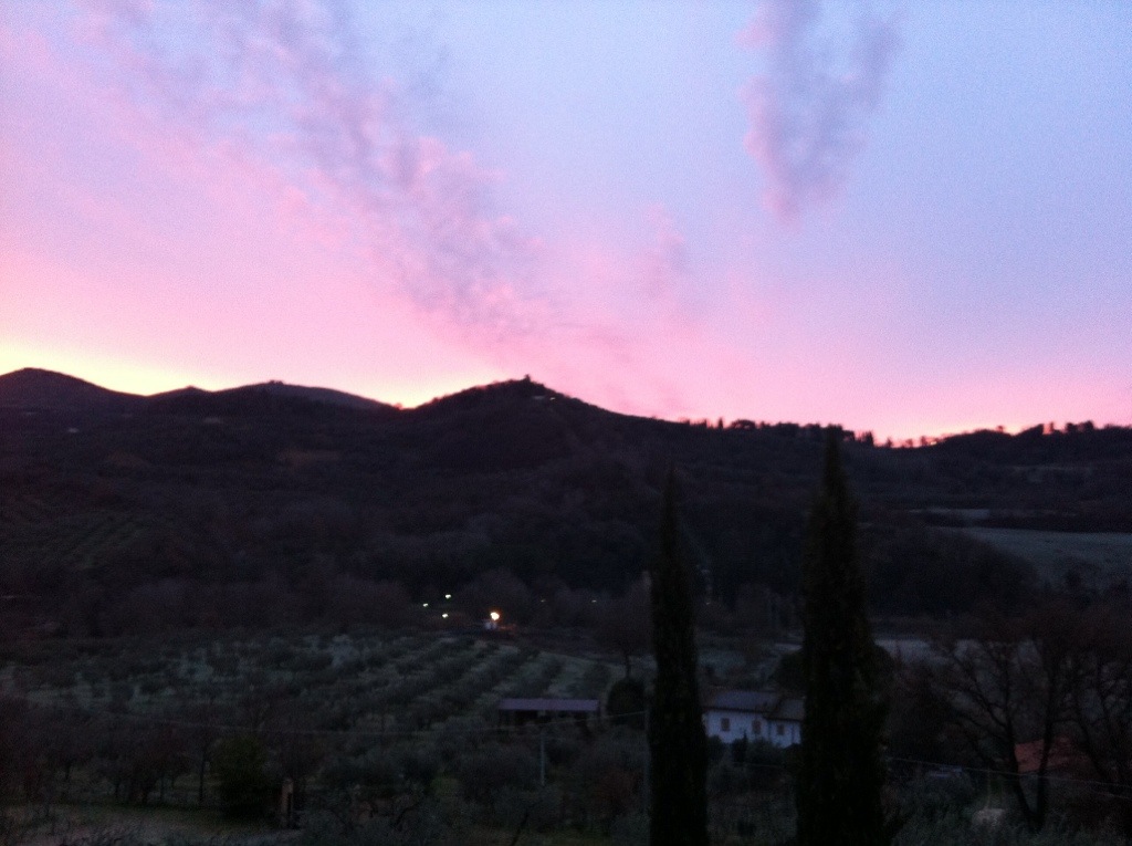 L’alba prometteva bene, oggi alle sette e spiccioli. E splendeva di rosa e d’oro sul monte Acuziano. Poi però il tempo ha preso un’altra piega. E il grigio ha prevalso (ma non l’ho fotografato…). E adesso regna assieme al freddo.