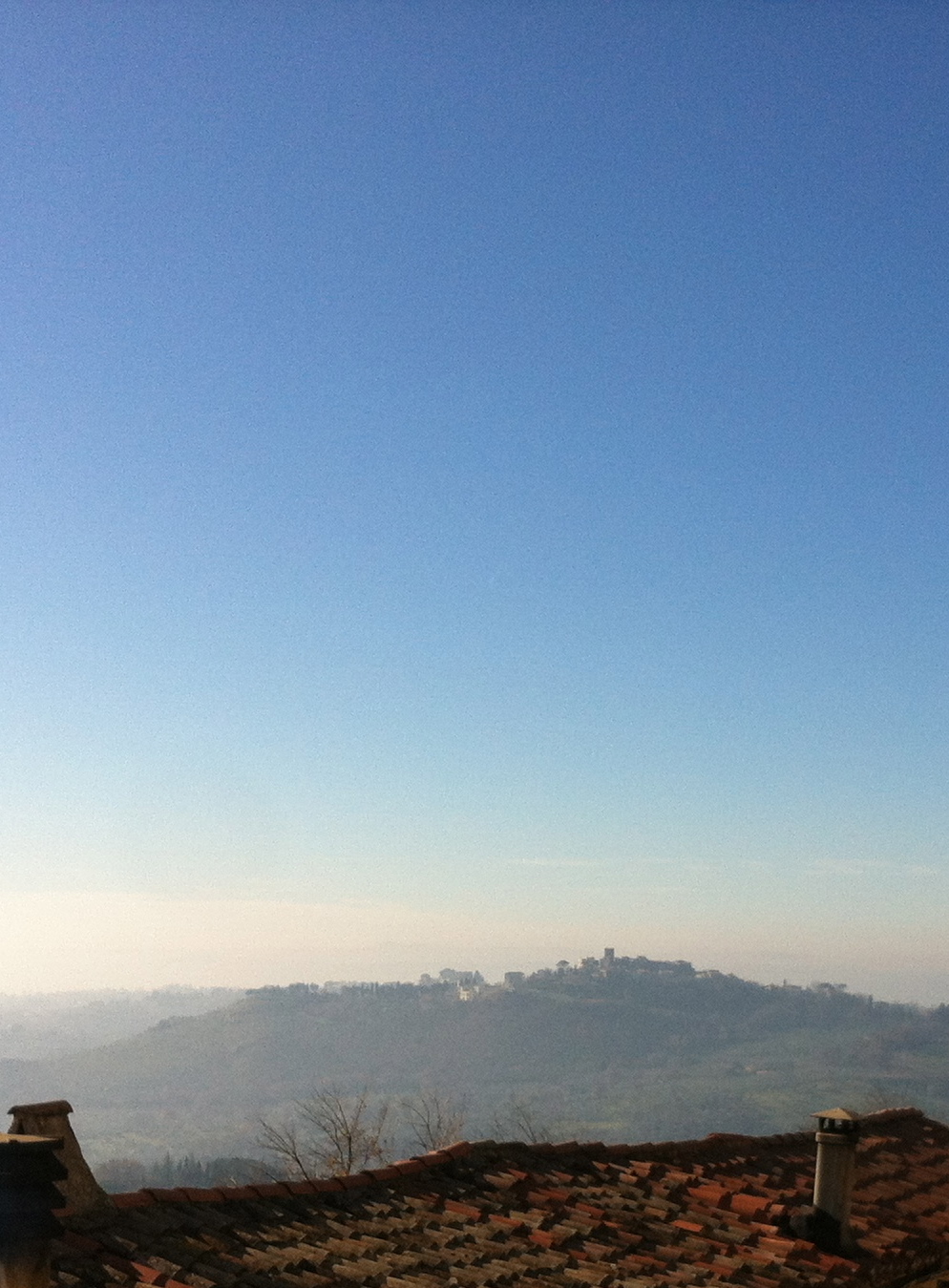 Con l’elettronica e i computer tutto è cambiato, ma i miei interventi sulle inquadrature originali si limitavano al minimo. E invece solo adesso capisco che è divertente – e che lo posso fare anch’io – rilavorare gli originali per tirarne fuori qualcosa di differente, a volte un’altra foto. Così per questo panorama del nostro paese da cui si irradia (o che è sovrastato da) un cielo che via via si scurisce. Il frame originario è successivo di due o tre scatti a quello da cui è stata ricavata l’immagine di “Dettagli”. Usciti da quella porta a Castel S. Pietro, se si guarda a destra la vista è quella dell’immagine sopra riportata. Anche se la foto originale era quella qui sotto…