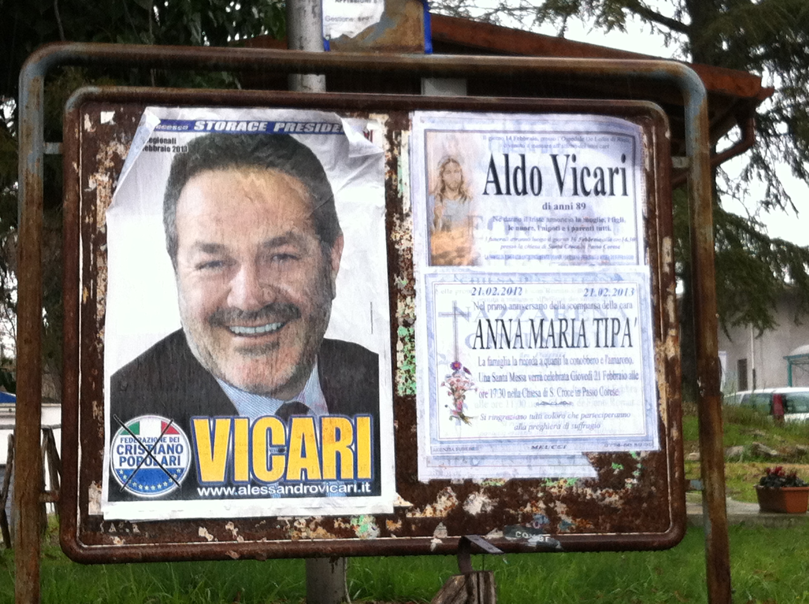 Mi ha colpito questa foto nel piazzale davanti alla stazione di Fara Sabina-Montelibretti (che in realtà si trova a Passo Corese…). Mi ha colpito la consonanza dei nomi sui due manifesti: quello elettorale, con il sorriso del candidato sopra il nome che chiede venga scritto sulla scheda; e quello funebre, dove un Cristo dolente affianca il nome di un vecchio signore di quasi novant’anni che ha concluso il suo percorso.