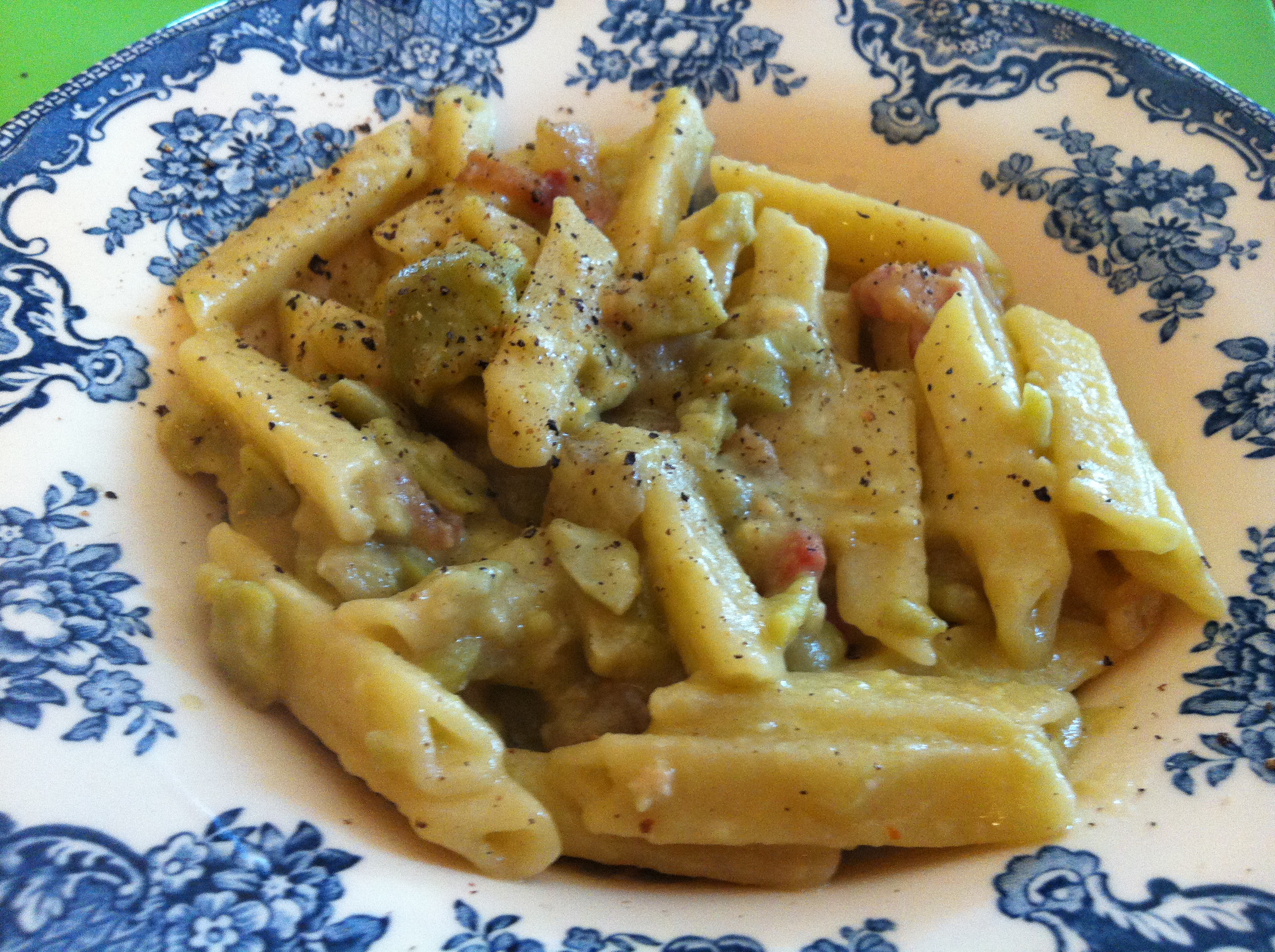 Il condimento consisteva in una specie di purè di fave, ovviamente sbucciate e fatte cuocere a fuoco bassissimo con mezza cipolla per il tempo che serve perché si sfaldino, allungando volta a volta con acqua o brodo (io ho messo nella prima tazzina d’acqua del brodo granulare vegetale, poi ho allungato con acqua e basta). Mentre la pasta cuoceva ho portato a croccantezza dell’abbondante guanciale del mitico Facioni di Poggio Mirteto, sfumato alla fine con un goccio d’aceto e poi messo a scolare del suo grasso. Al momento della mantecatura ho aggiunto del pecorino bello stagionato di Monte Poro, un filo d’olio fresco e una grattuggiata di pepe. Il tutto accompagnato da una bottiglia di Luna Mater del 2010, il Frascati di punta di Fontana Candida (devo dire niente affatto male: non so quanto tipico, ma con un buon corpo e una buona beva).