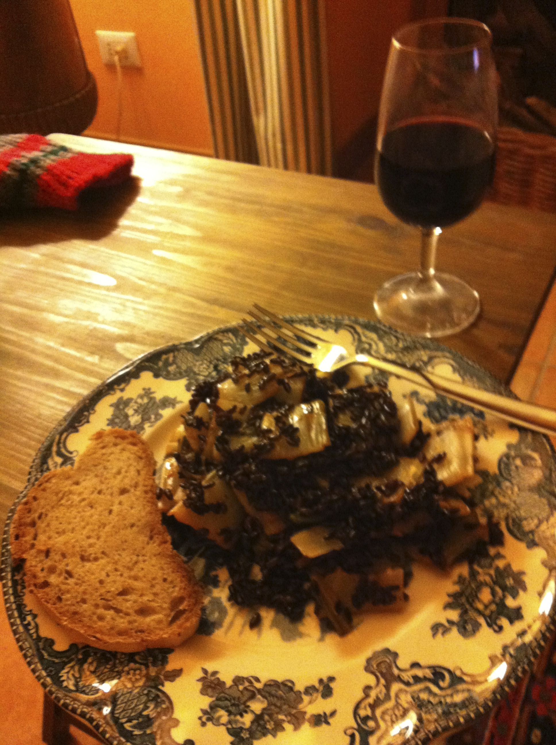 Sei anni fa iniziava una conoscenza che presto sfociò in amore, quella tra me e il riso Venere. Non lo mangio spesso – ci vogliono tre quarti d’ora, se non di più, per cuocerlo bene – ma ogni volta è una festa. Con la bieta – le coste – è amore da sempre. Ma anche le coste non le mangio troppo spesso: a dieci metri dalla nostra cucina è cresciuta una vera e propria «bietaia» ma è la bieta di tipo selvatica, con coste lunghe e snelle, fantastica anch’essa. E dunque, tra una comprata al supermercato e una raccolta qui, la scelta è quasi scontata, no? Rispetto alla «ricetta» che riporto nel post, nel corso degli anni ho scoperto una cosa fondamentale: che se agli ingredienti citati ci aggiungi un po’ di semi di finocchio – o quand’è stagione un po’ di finocchietto selvatico – il tutto acquista un valore aggiunto che lo fa decollare verso l’empireo dei piatti perfetti. E dunque viva il riso Venere e viva la bieta. E viva il loro incontro.