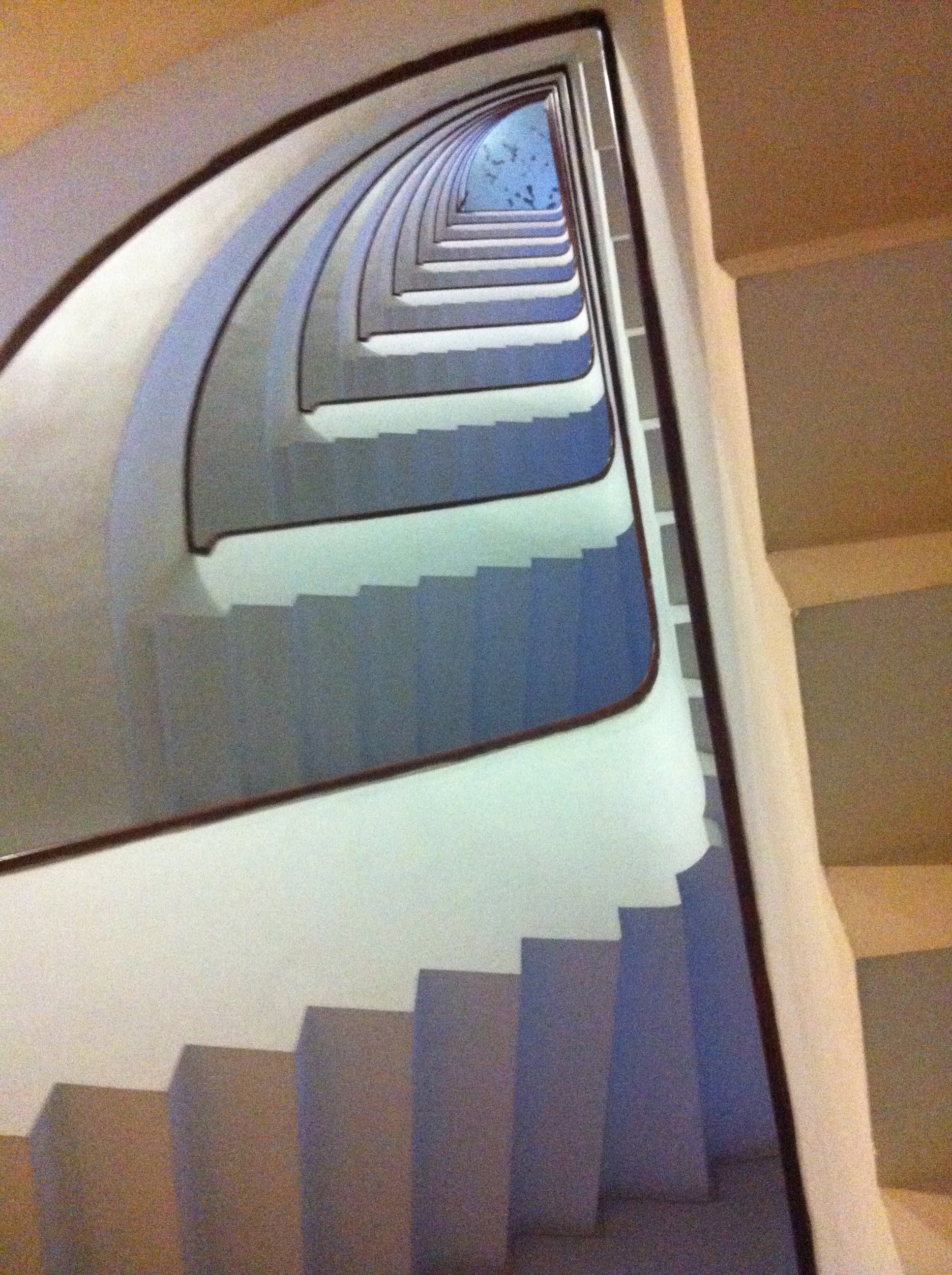 Uscendo ho fatto una foto alla tromba delle scale, che già mi aveva colpito entrando. Bellissima e originale. Come bello e originale è, a suo modo, tutto il palazzo. Magari un’altra volta fotograferò anche l’esterno (oltre a cercare altre in quadrature delle scale…)