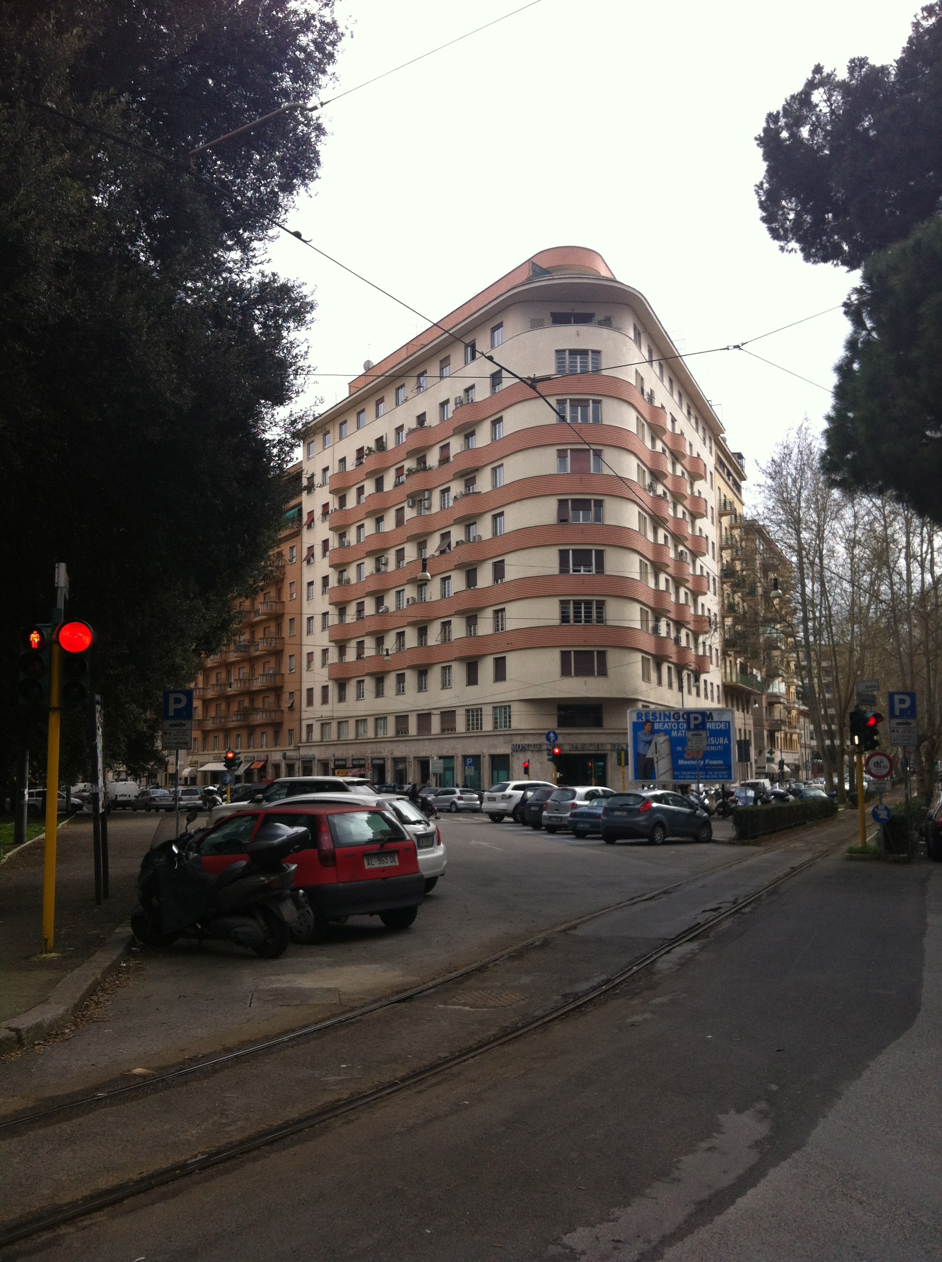 quei palazzi che lo noti solo se alzi la testa e lo guardi attentamente, ma che con quella fascia ondulata dei balconcini in laterizi rossi è decisamente piacevole (come può essere piacevole un palazzone di nove piani…).