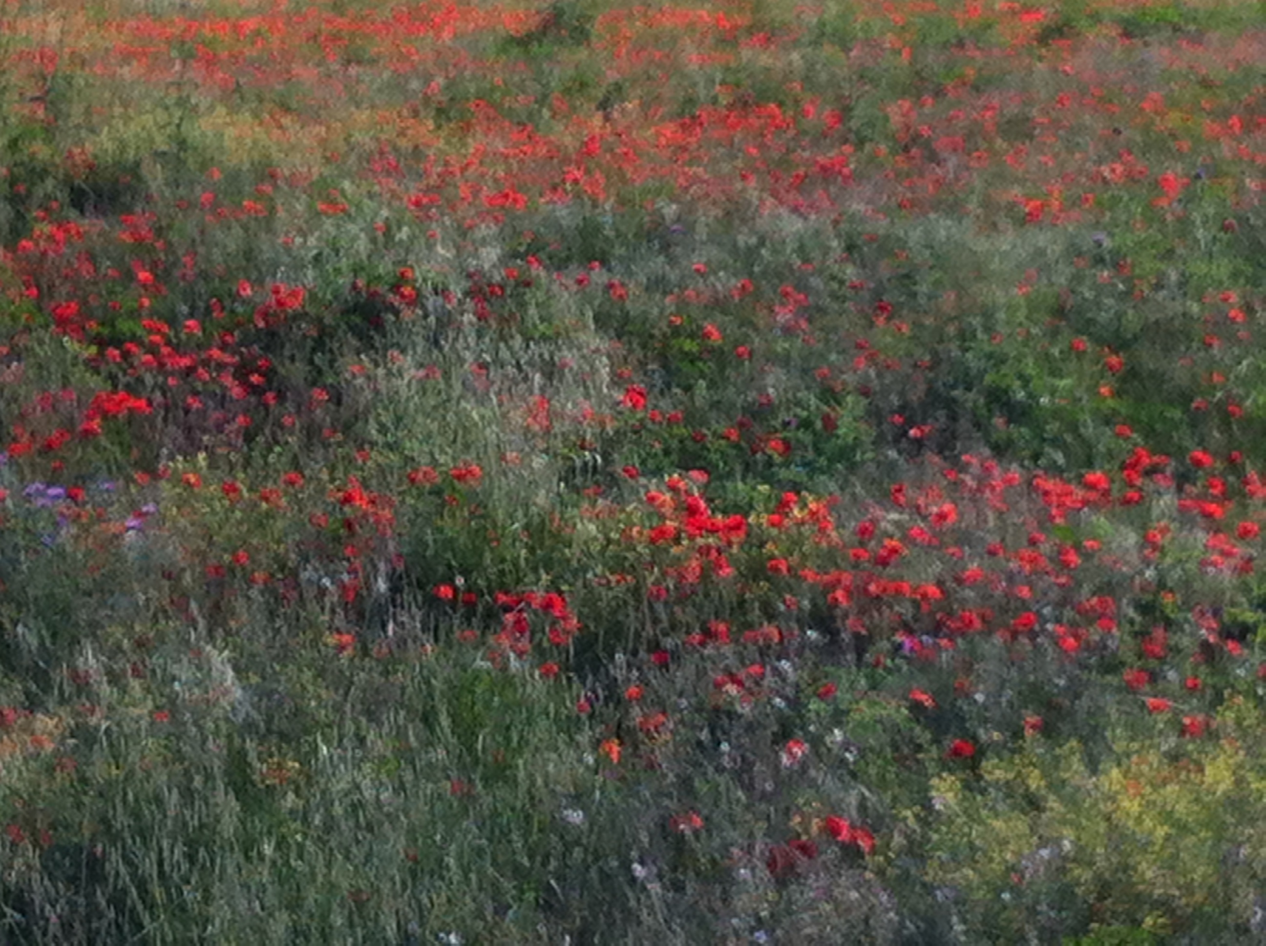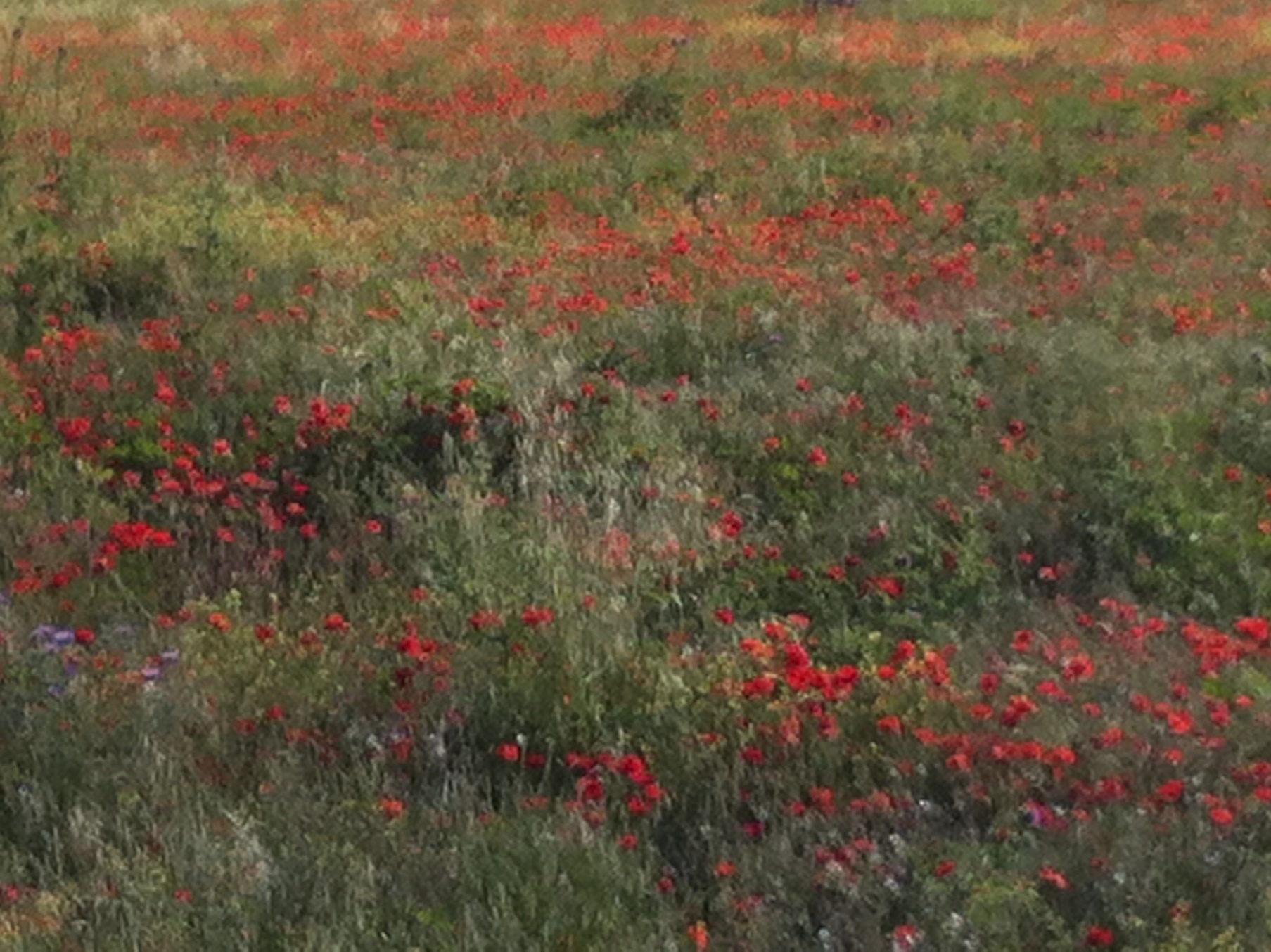 Me n’ero accorto, di questo mare di papaveri, guardando dal prato davanti casa, tra gli olivi i meli e le querce sul nostro confine: c’era una macchia di colore inconsueta, che si vede proprio al centro della foto, giù verso la centrale…