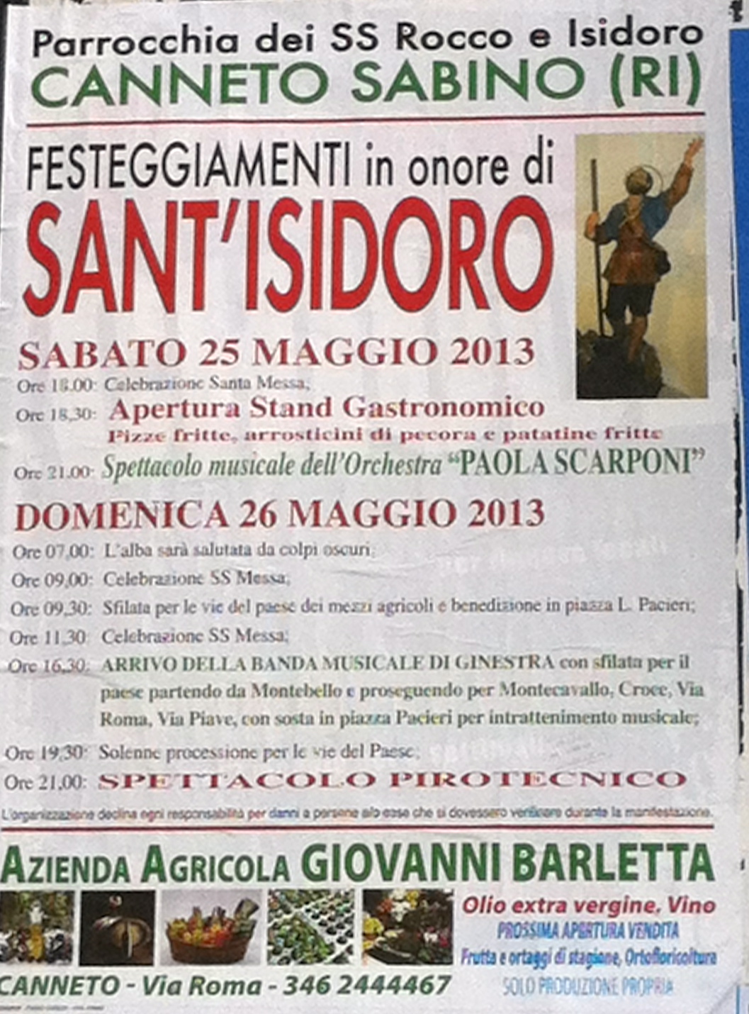 Come per la festa che Canneto Sabino, ridente (?) frazione di Fara Sabina, dedica a Sant’Isidoro, patrono del paese. Conoscevo Canneto per l’Olivone (il più grande olivo d’Europa, dicono – vedere per credere). Adesso resterà nella mia memoria per i “colpi oscuri” con i quali viene salutata l’alba di domenica 26 maggio. Le virgolette sono mie, ché nel manifesto la scritta Ore 7: L’alba sarà salutata da colpi oscuri sta lì, all’inizio della giornata, come se fosse una cosa comune e chiara per tutti. Non sono di Canneto e non so che cosa siano i “colpi oscuri”. D’altronde non ci penso nemmeno ad alzarmi alle sei per essere alle sette in paese a sentirli, questi colpi oscuri. Resterò con la curiosità.