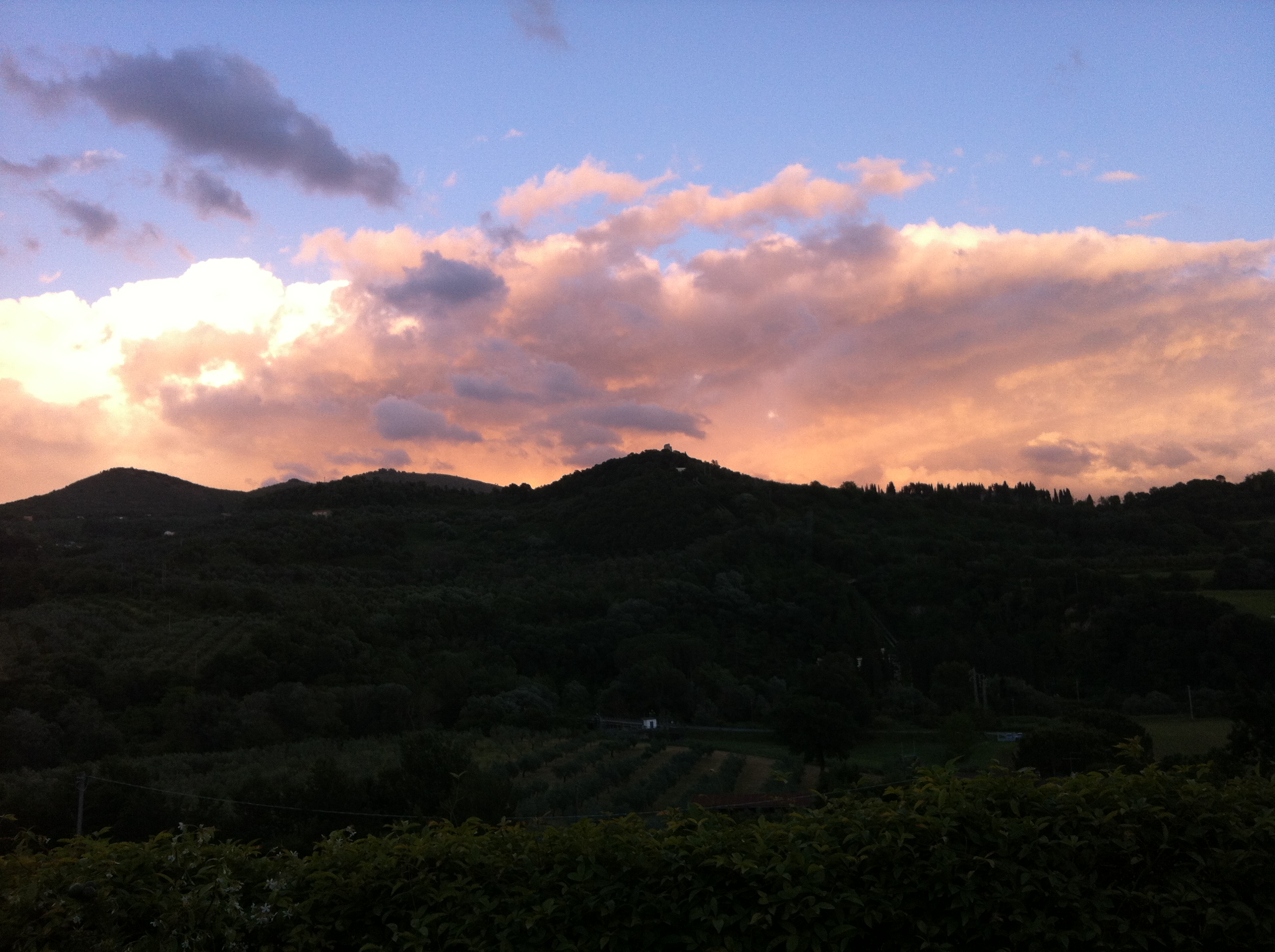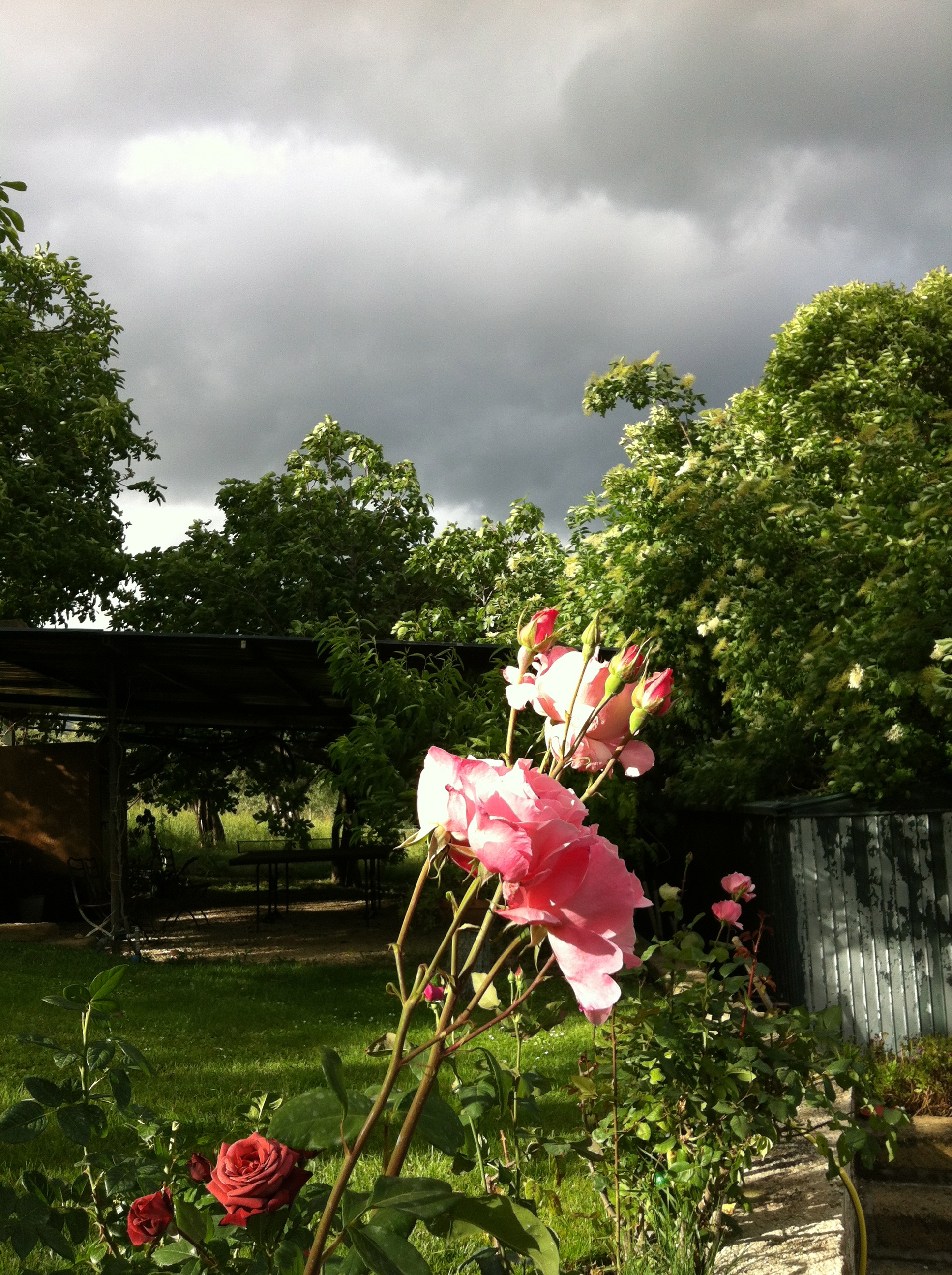 Qualche giorno fa, verso il tramonto, alle 18 circa, il sole di tra gli alberi illumina a fasci di luce le rose agitate dal vento, mentre a Nord (ma anche a Est e a Sud, fuori dall’inquadratura) nuvole grosse e nere sembrano prepararsi a dare la loro (i fatti al posto delle parole…). E invece poi non pioverà, almeno non fino a notte, e alle venti circa le nubi sul Monte Acuziano, con il loro incarnato color perla, assorbono tutta la luce che resta e lasciano la valle nell’ombra quasi totale.
