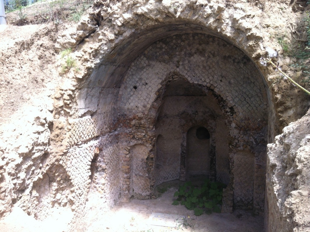 Poco sopra il fontanile, si vedeva una grotta. Sono salito e, recintato e coperto, e ricavato nel pendio della collina, c’era questo che mi pare un tipico ninfeo di epoca romana (e il fatto che sia un ninfeo mi pare ancora più probabile se si pensa che si trova praticamente attaccato a una sorgente). Un ninfeo di cui non avevo mai letto nulla. E chissà se era una costruzione isolata o faceva parte di una villa di campagna di qualche maggiorente romano…