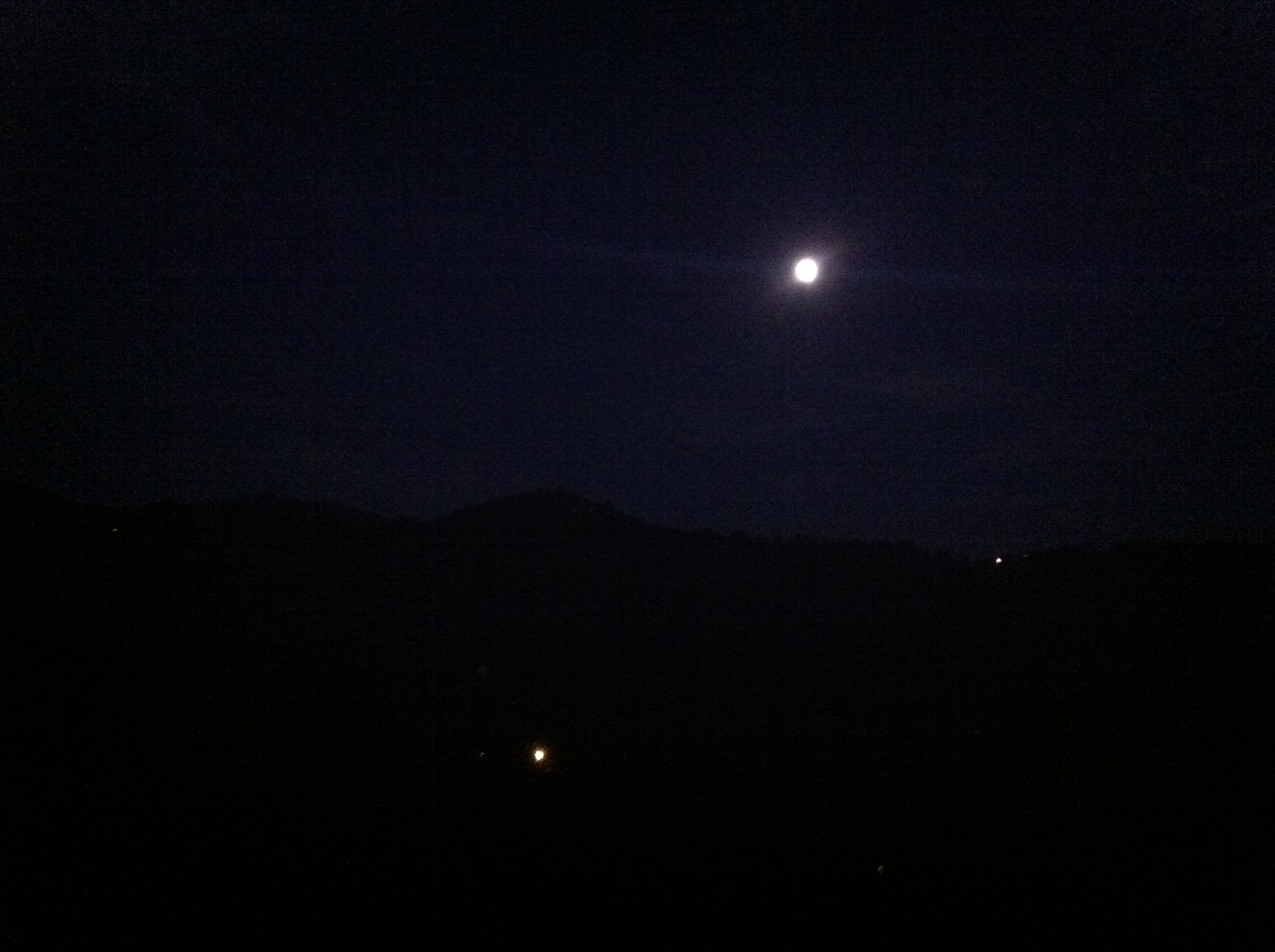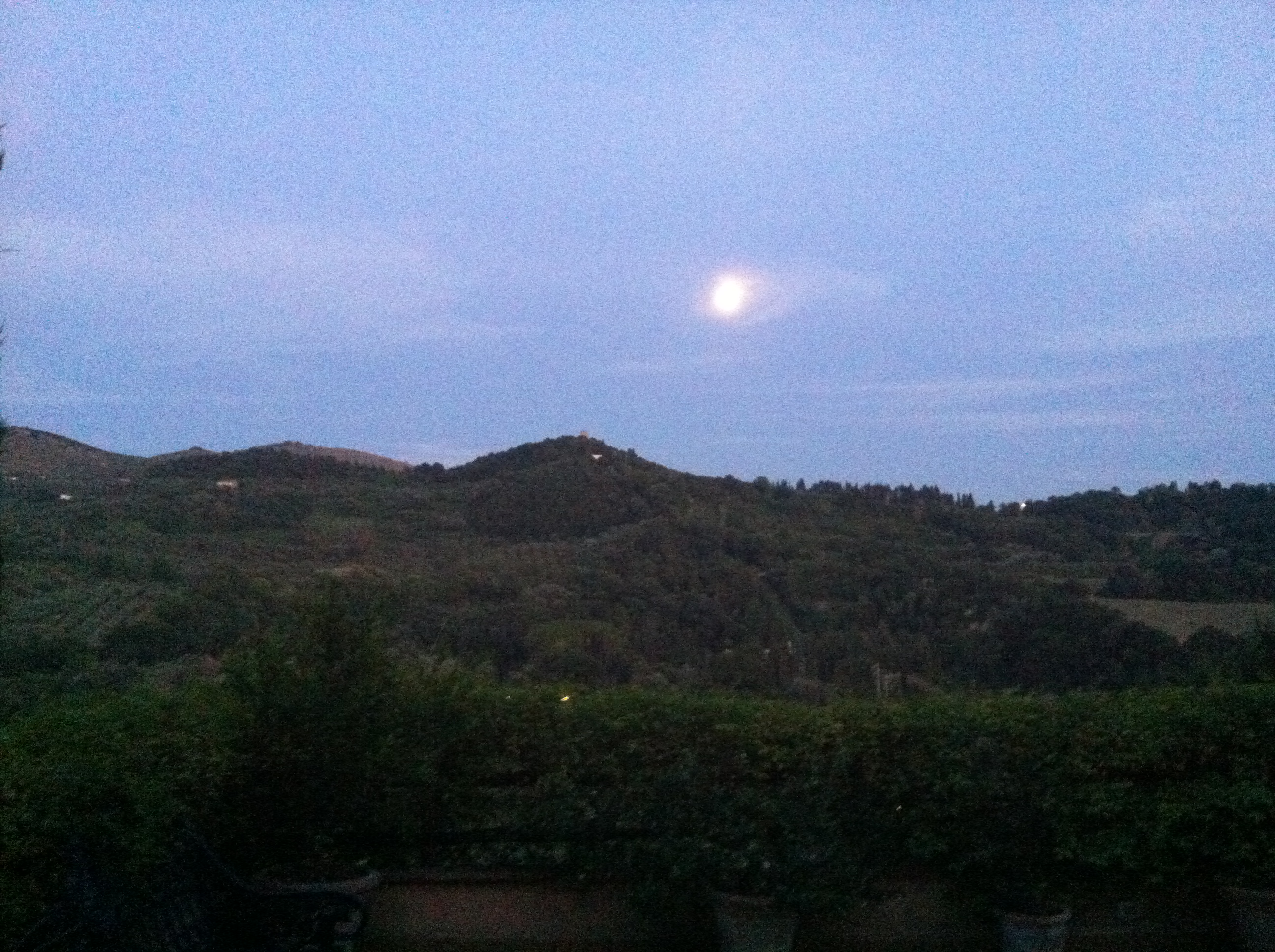 Ieri sera luna piena o quasi. L’imagine più bella è quella delle 8 meno dieci o giù di lì, con ancora un bel po’ di luce in cielo: un pallone bianco in equilibrio sulla torre medievale.