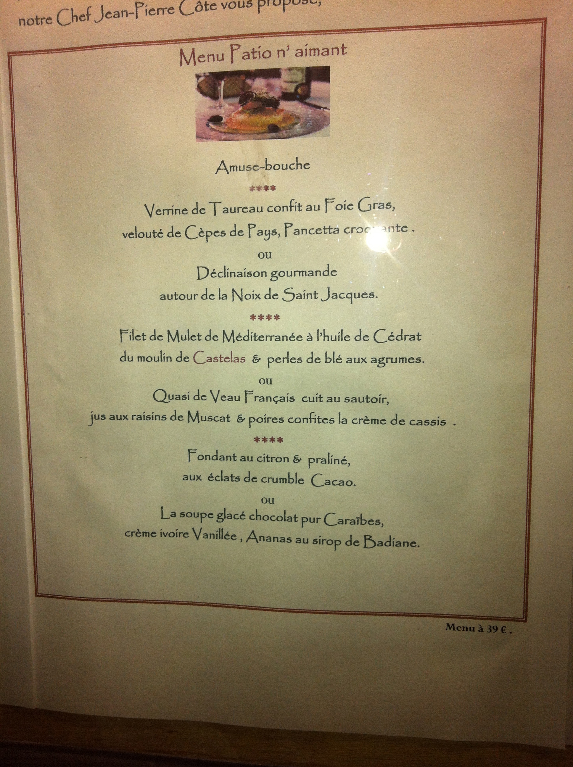 Di ritorno dal viaggetto nel Sud della Francia, in macchina con Angelo e Mina abbiamo fatto, per ingannare il tempo, il gioco della “cena migliore”. Io non ho avuto dubbi: pur avendo mangiato in ristoranti davvero buoni, il ricordo per me indimenticabile (ma da subito, nel mentre della cena direi, un ricordo poi rafforzato dalla memoria) è quello della serata a Le Patio di Fontvieille. E dire che ci siamo andati solo perché la Regalido, il resort dove alloggiavamo (munito anch’esso di ottimo ristorante, cucina inventiva e intelligente, ma che non mi è rimasta nel cuore) quella sera era chiuso. Così abbiamo fatto due passi e siamo andati a poche decine di metri a fare questa nuova esperienza.