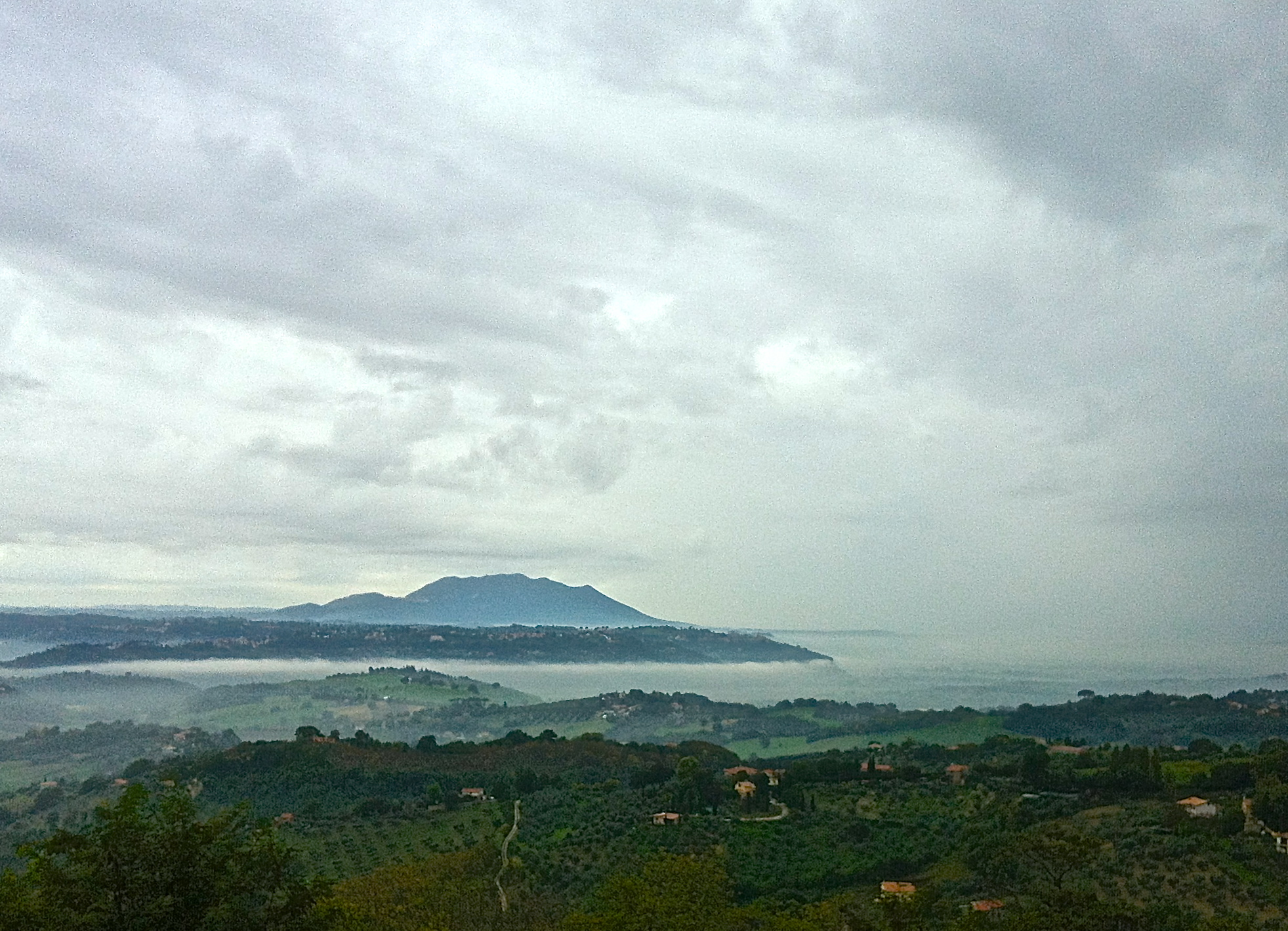 Davanti alla porta attraverso la quale si entra in Montopoli, lungo la via che inevitabilmente si chiama Via Roma, c’è una terrazza che si apre su un panorama assai bello. Bello di sera, al tramonto, quando il sole scende dietro il monte caro ad Orazio con dei concerti di colori che stordiscono. Ma forse ancora più bello certe mattine, quando la nebbia copre la valle del Tevere come un mare bianco dal quale emergono le alture della zona, prima di tutte quella dove sorgono Torrita Tiberina (a sinistra) e Filacciano (a destra).