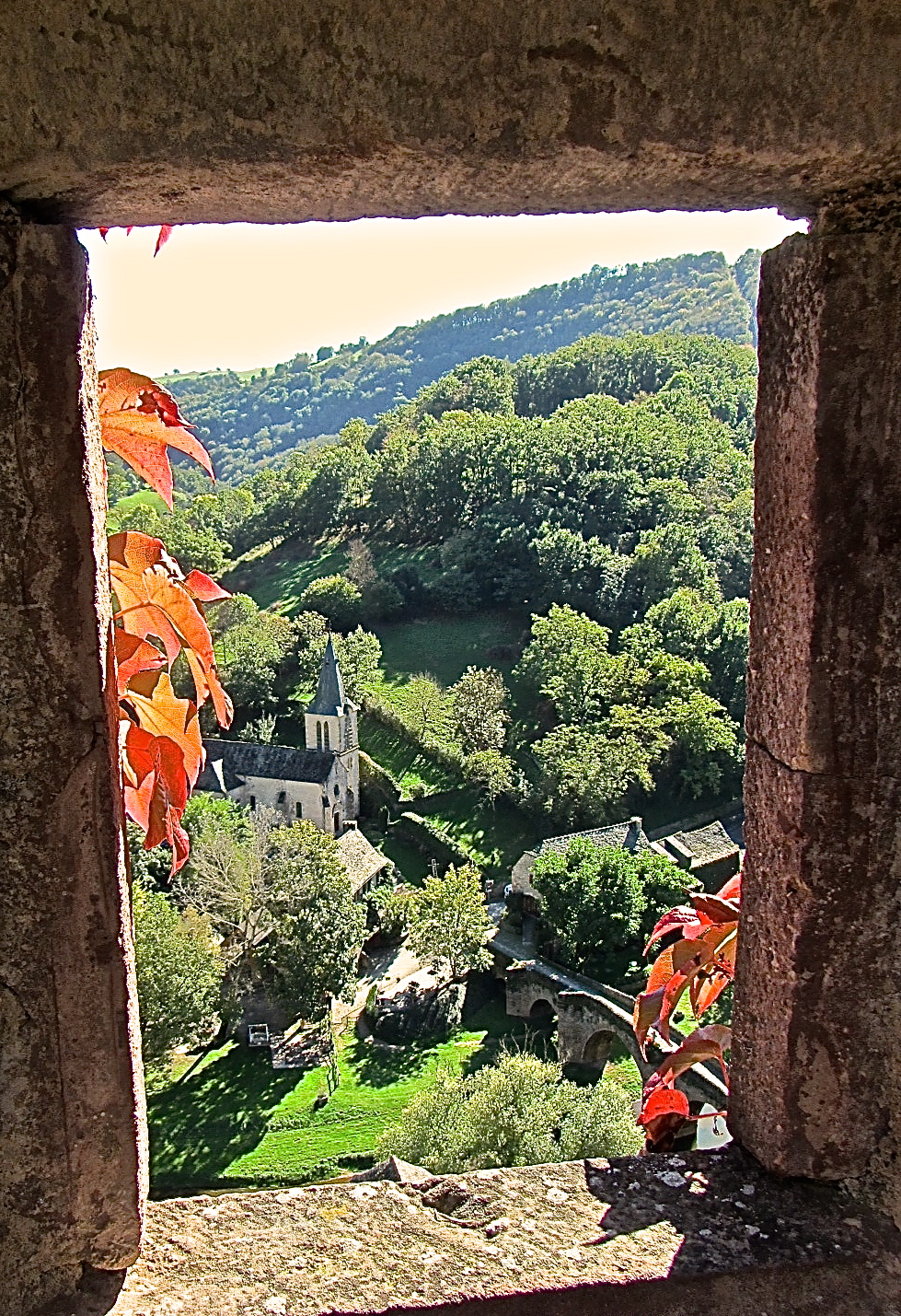 Quando si visita il castello (piccolo dramma personale: ho avuto il mio primo sconto da vecchio; qui da noi bisogna avere 65 anni per usufruirne, lì bastavano 60), nel quale c’è una bella collezione d’armature dei nuovi proprietari, in un pezzo di spalti ricostruiti (quelli che nelle foto in alto sono parzialmente ricoperti da un rampicante rosso) si aprono tre finestre di diverse forme e dimensioni. Ma il panorama è lo stesso: la chiesetta, il fiume e (nella terza foto) il ponte a schiena d’asino .