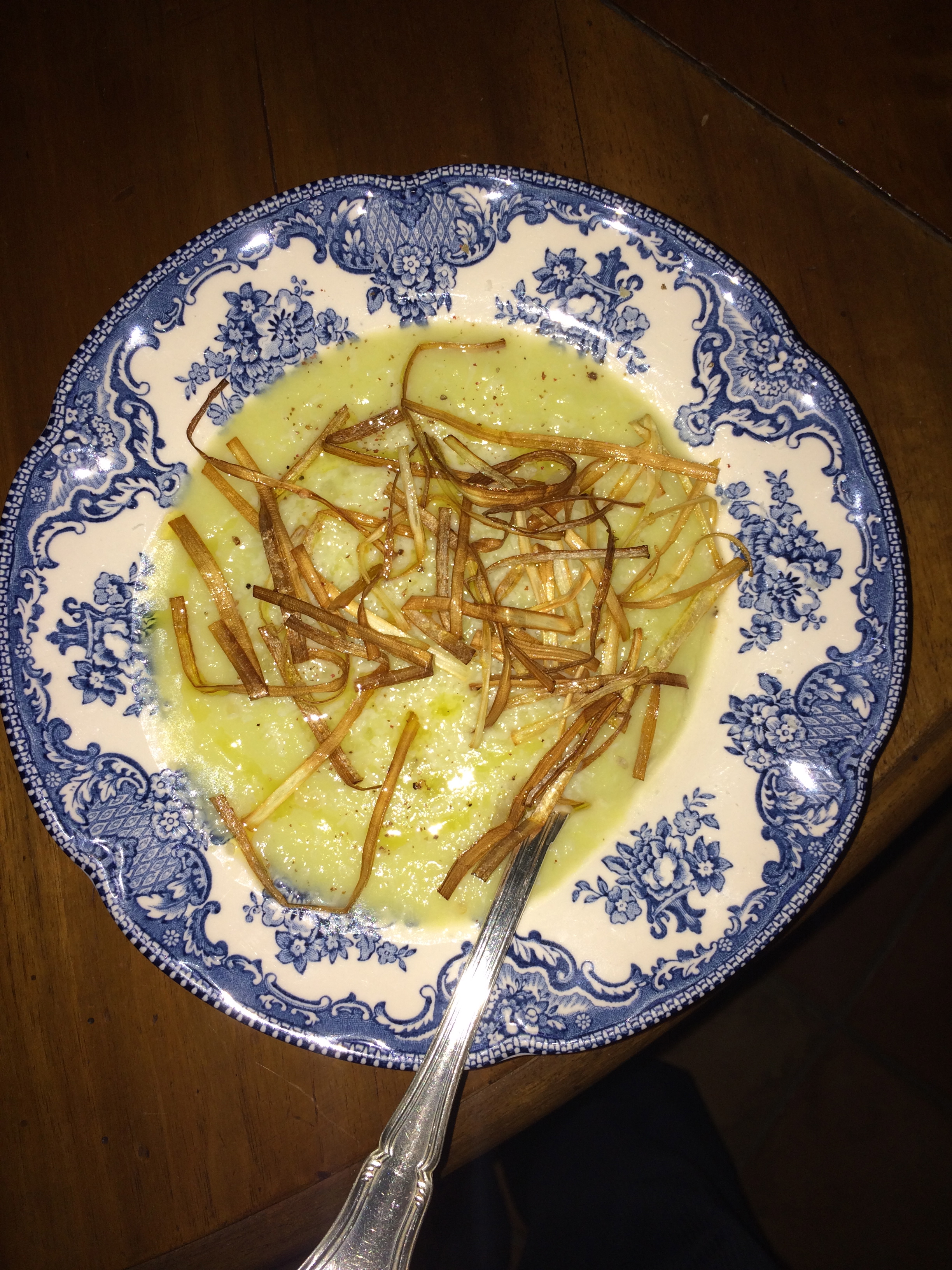 Ieri sera cena minimalista e quasi perfetta (anzi, tolgo il quasi). Per entrée una splendida vellutata (si dice così?) di porri “al quadrato”. Un piatto che dire povero è minimizzare (povero ovviamente nel senso del costo, perché ricco quant’altri mai d’invenzione), che Daniela ha copiato dal grande cuoco Igles Corelli (dal quale eravamo stati a mangiare secoli fa alla Locanda della Tamerice di Ostellato, sua seconda incarnazione dopo il mitico Trigabolo di Argenta) che l’aveva realizzata in una delle sue esibizioni sul piccolo schermo. La preparazione sembra (ed è) semplice. Rondelle di porro a stufare nell’olio e in un brodo fatto con altro porro e (aggiunta di Daniela) patata. Alla fine, quando il porro è bello stufato, si minipimerizza il tutto e, se serve, si allunga con un po’ di brodo tenuto da parte. Prima, quando all’inizio si è sfogliato il porro, se n’è tenuta una o due foglie esterne, che vengono affettate sottilissime e poi fritte nell’olio.