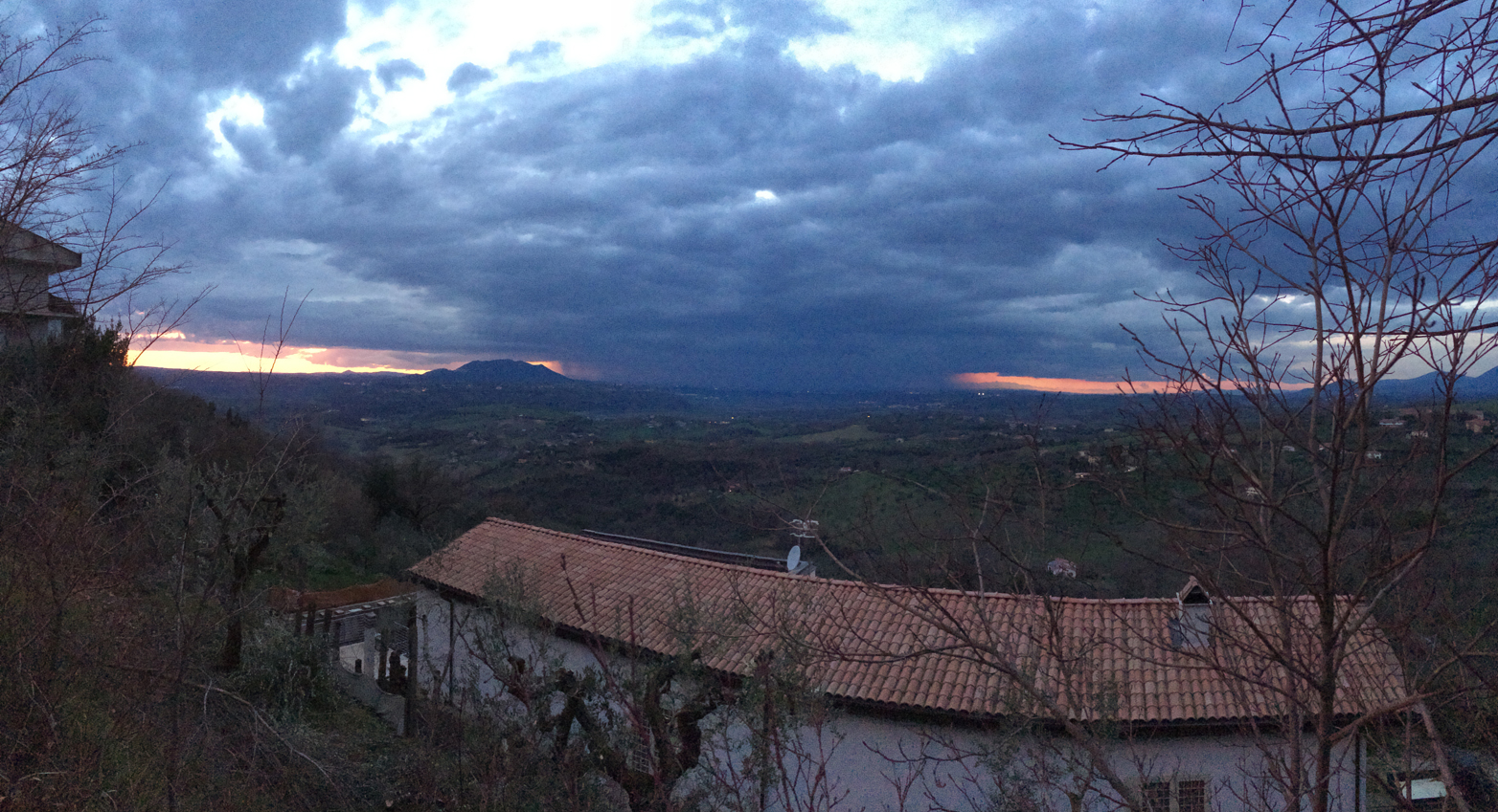 Tornando verso casa, lo spettacolo della valle del Tevere, e oltre, era ancora meglio, se possibile. Con il tramonto schiacciato in basso da nuvoloni neri, mentre in alto nel cielo c’erano ancora sprazzi di chiaro. Un tramonto, per di più, che sembrava presente quasi solo a sinistra del Soratte. A destra, c’era solo un piccolo spazio occupato dal rosso del sole che scendeva, e poi c’era il nero della notte.