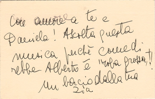 Ieri ho sentito per la prima volta un cd che fa parte di un mucchietto che la zia Marcella mi fece pervenire via Marco due o tre anni fa, accompagnati da questo bigliettino autografo.