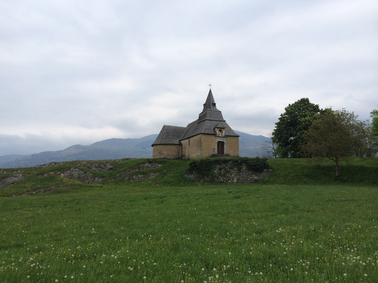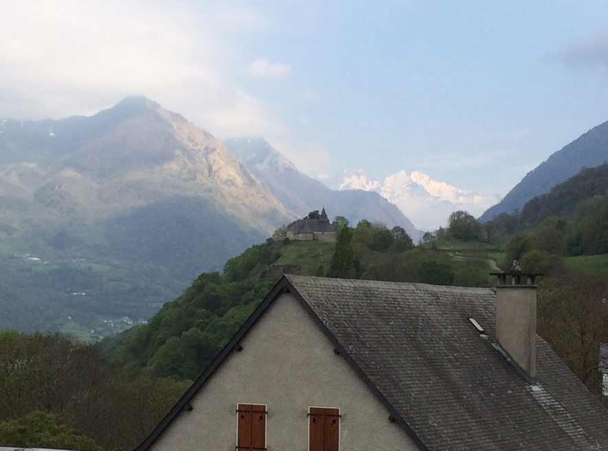 Dalla piazza, sullo sfondo delle montagne coperte da neve assai recente (il passo del Tourmalet era chiuso per impraticabilità) si vedeva una chiesetta lontana