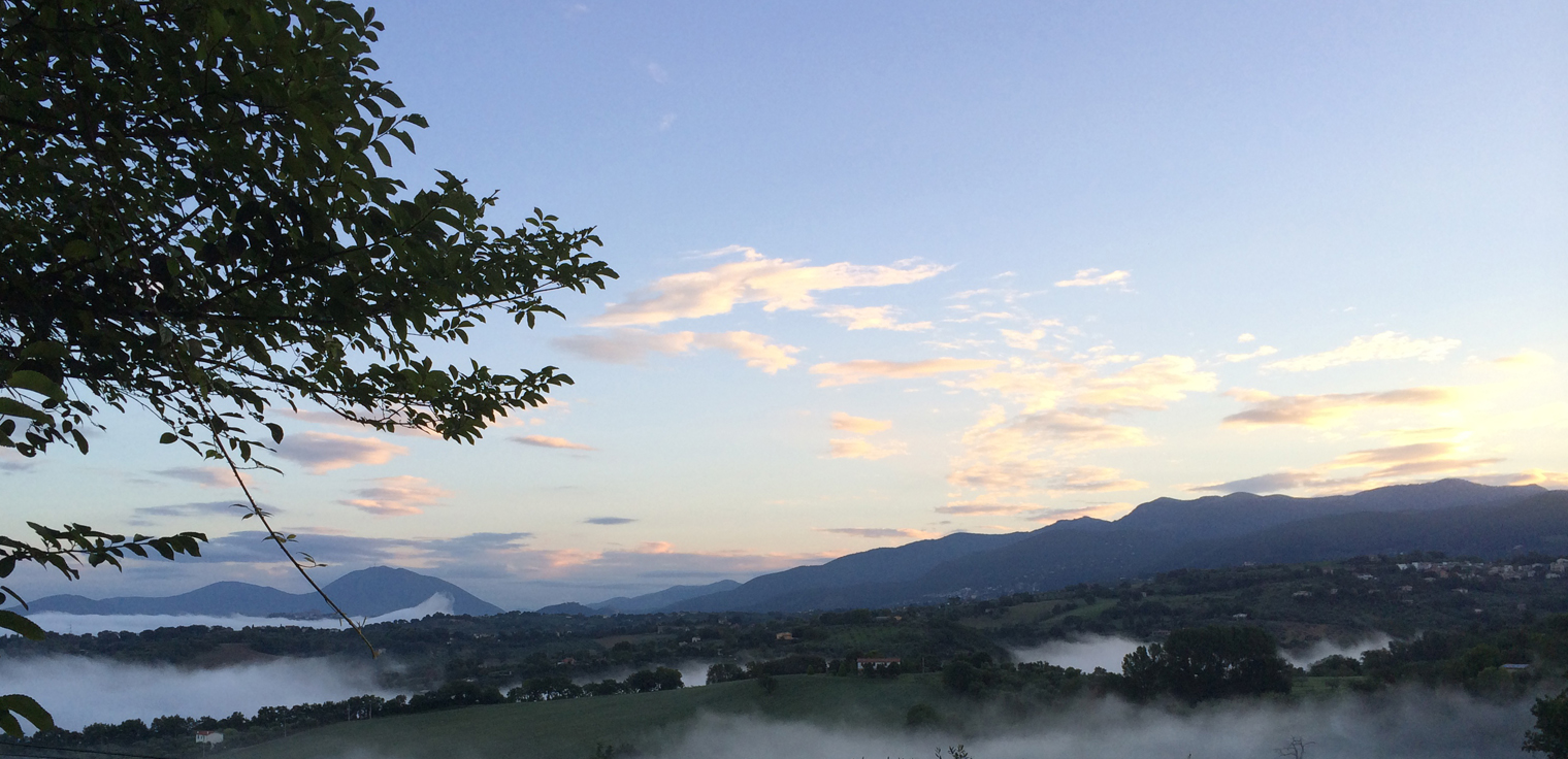 Oggi, un po’ prima dell’alba, sulla strada che dai Granari scende verso Colonnetta. Il Soratte si staglia limpido nella luce del nuovo giorno. Ma sotto, nella valle del Tevere e nelle convalli che salgono verso il paese, la nebbia la fa da padrona.