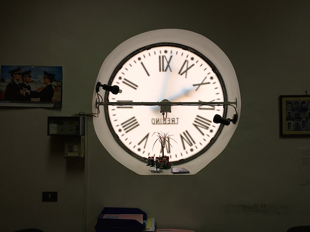 L’altro giorno sono stato in Comune per chiedere lumi su Tasi, Tari, Imu e compagnia bella. Sono salito al secondo piano, nella stanza dell’Ufficio Tributi, e ho avuto i miei chiarimenti. Solo dopo un po’ che stavo lì mi sono accorto che una delle finestre era un po’ strana. E che sopra i timbri e gli ammennicoli vari tipici di un posto di lavoro splendeva il retro dell’orologio del palazzo comunale.