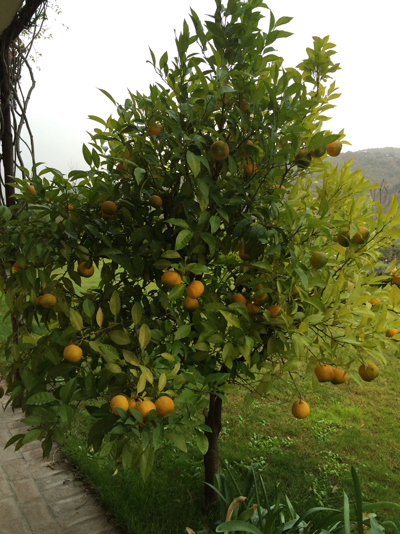 In una brutta giornata come questa – il tempo è proprio triste, in maniera più che autunnale; e stamattina siamo andati a salutare Renato, che ieri è morto in un hospice a S.Maria della Pietà – conforta la vista dell’arancio piccolo in fondo alla discesa, carico all’inverosimile di frutti, tanto che è stato necessario mettergli un tutore per alleviarne la fatica. È del tipo Navel, le arance sono piccole ma succose. Tra questo e gli altri due alberi d’arancio – un altro Navel grosso tre volte tanto e un tarocco – è facile prevedere spremute garantite per tutto l’inverno…
