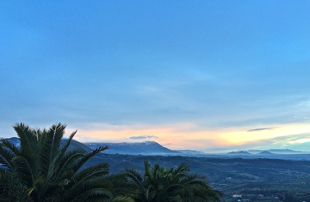 L’altro giorno, tornando a casa in una pausa della pioggia, prima, dal belvedere davanti alla porta di Montopoli, il solito Soratte a Ovest, nella luce un po’ blu dell’inverno sotto le nuvole (erano le cinque e un quarto del pomeriggio). E tre minuti dopo, all’altezza del Convento ma in un’altra direzione, verso Sud, il monte Gennaro, S.Angelo Romano e Montecelio, con qualche rimasuglio di sole all’orizzonte.