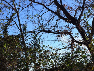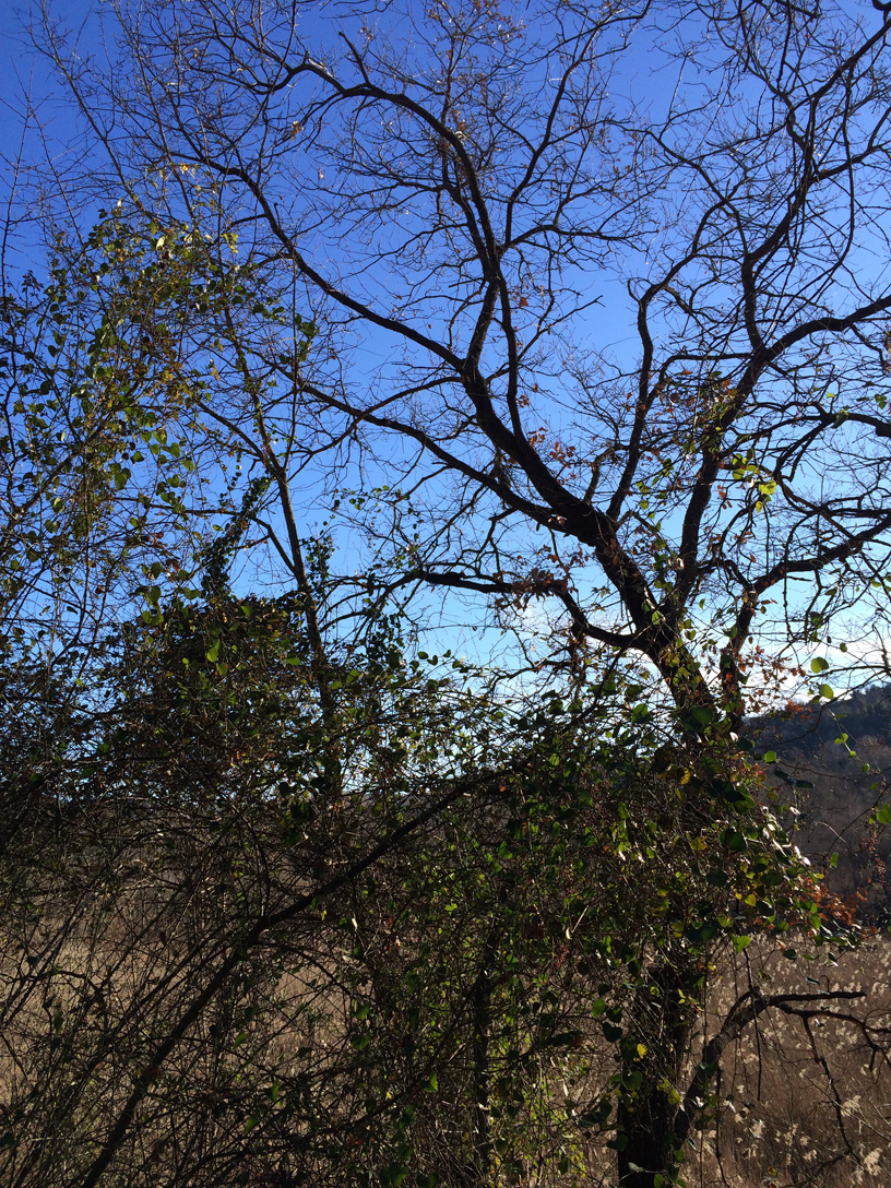 Stavamo sulla passeggiata, nel punto in cui un masso in mezzo alla strada blocca la strada alle macchine, quando Orsetta scatta come un ghepardo (si fa per dire…). In lontananza, una lunga coda nera finiva di sparire sul bordo della strada e saliva su un albero. Orsetta aspetta un po’ lì sotto, guarda all’insù, si agita, si calma e se ne va. Nel frattempo sono arrivato io. Guardo all’insù e non vedo nulla. Fermo immobile (no, non sono io quell’animale…) continuo a guardare e vedo il nostro “Ciop”, o meglio la sua silhouette, su un ramo. Tiro fuori l’i-Phast (che tanto phast non è, perché devi digitare la combinazione, e due su tre la sbagli, devi aprire l’icona della macchina fotografica e puntare, insomma, di tempo ce ne vuole…) ma lui è ancora lì, fermo, immobile come una foglia quando non soffia un alito di vento.