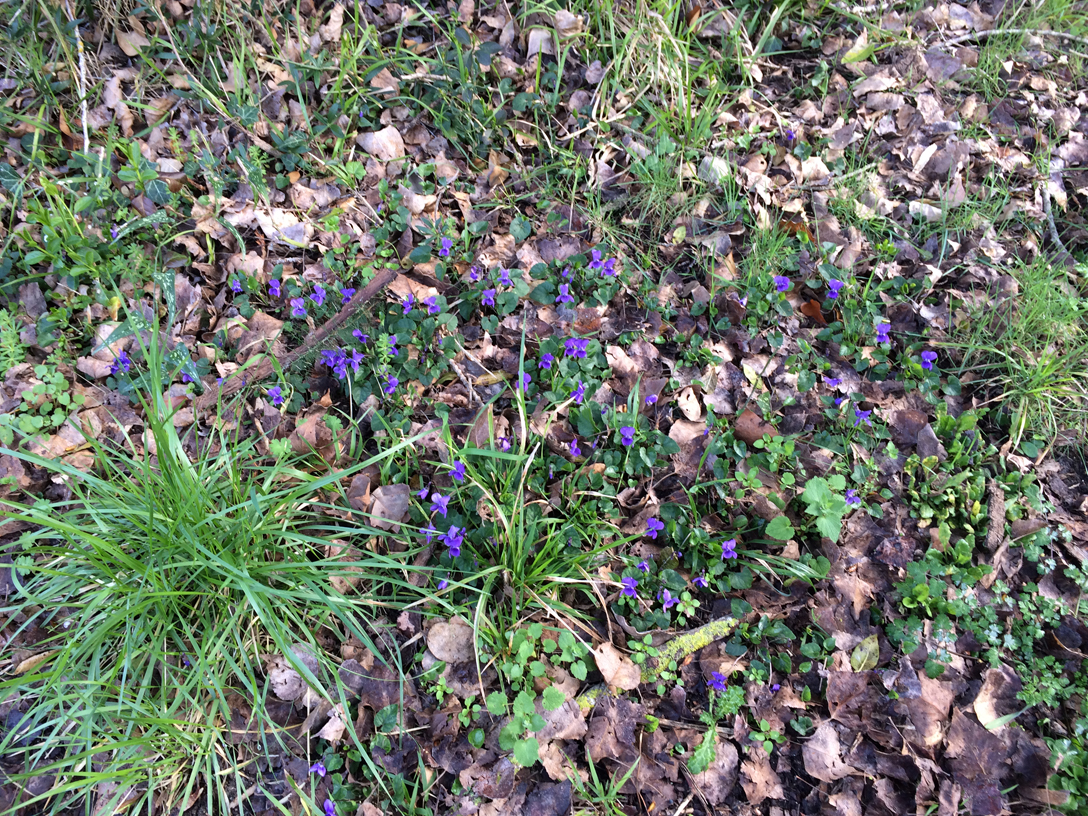 Stamattina quando ho iniziato a passeggiare c’era un bel sole e faceva quasi caldo. Tanto che mi dicevo quanto sembrasse incredibile la previsione di freddo e addirittura neve per domani. Sul sentiero, oltre alle solite foglie secche, ciuffi d’erba nuova e anche questo bel campetto di violette.