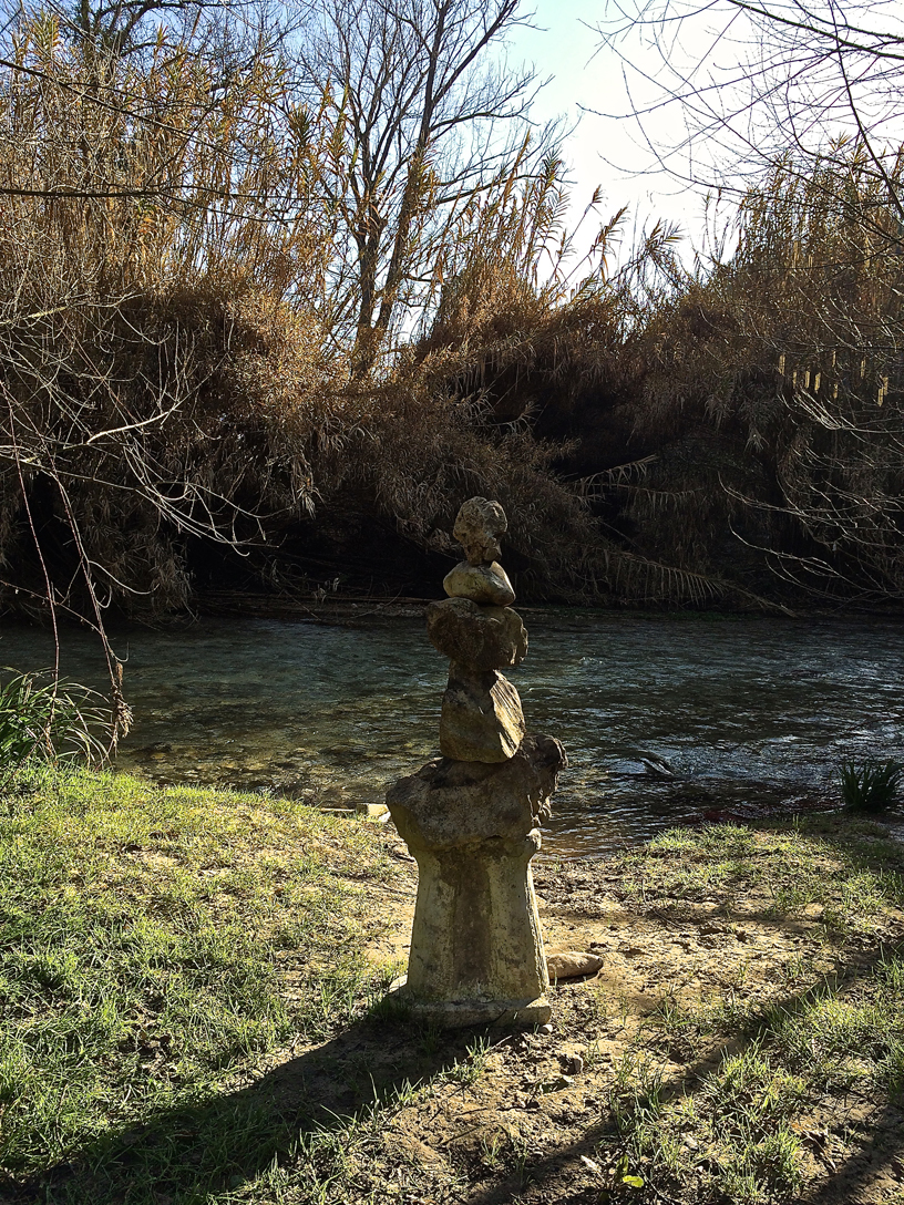 Ieri mattina arrivato al ponte sul Farfa ho avuto una sorpresa. Sulla spiaggia sottostante, dove rimasugli di falò testimoniano di serate (soprattutto d’estate ma non solo) sul bordo dell’acqua, era comparsa una statua, con tanto di piedestallo.