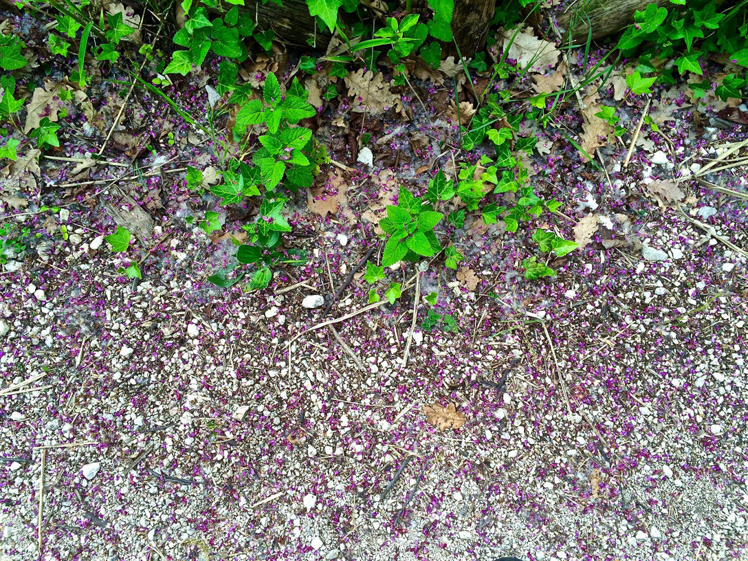 Tornato dal viaggio in Alvernia (ne sto ruminando i ricordi, tra un po’ ne scrivo…) ho ripreso le passeggiate mattutine, con Orsetta, Chicca e l’i-Phast. L’altro giorno mi hanno colpito sul sentiero i colori della primavera: il verde delle foglie, e i puntini di un rosa molto carico, quasi viola, dei petali caduti dei fiori degli alberi di Giuda che colorano la valle di pennellate di rosa in questo periodo dell’anno.