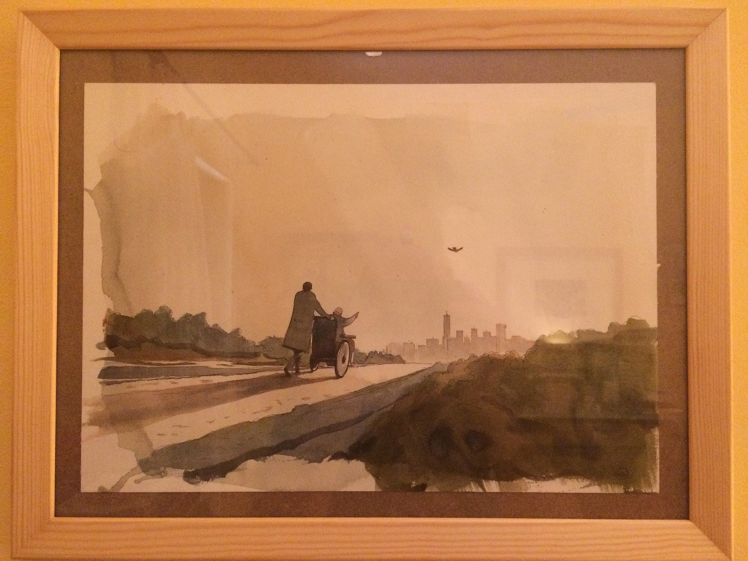 E così il vecchietto in sedia a rotelle che all’imbrunire si fa spingere verso la città lontana, seguendo un volatile che va proprio in quella direzione, adesso è appeso a fianco del mio letto, vicino a una delle Lune di Hugo Pratt e proprio di fronte a quell’acquatinta di Folon (che si riflette in parte sul vetro della cornice) con la quale ho cominciato la mia piccolerrima “collezione”.