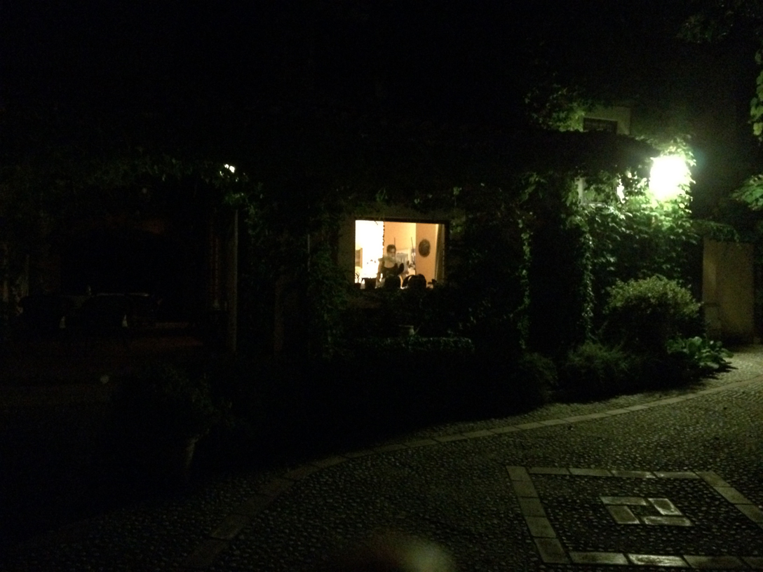 In Sabina niente “falchi della notte”, niente bar pieni di solitudini. Ma da fuori, rientrando dopo la discesa in campo “ad mingendum” con Chicca, compresa di solita pantomima (“ecco, mo’ ho fatto, sei contento?”), dietro il vetro della stanza illuminata si staglia una donna, mia nipote Giulia, mentre fuori i lampioni permettono all’i-Phast di dettagliare pavimento e rampicanti.